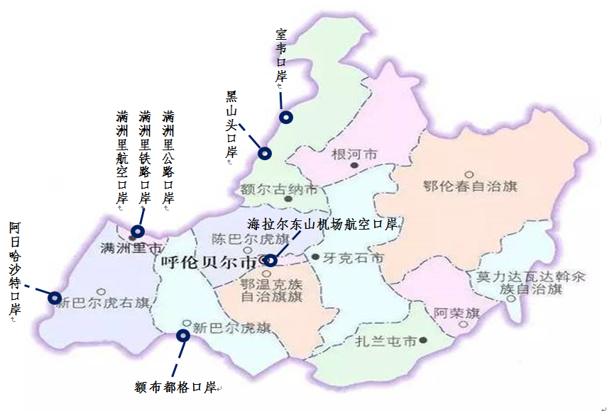 值得关注的是,呼伦贝尔市8个口岸之间实现了差异化发展,对于每个口岸赋有独特的定位:将满洲里口岸建设成连接东北亚与欧洲陆路大通道上的国际综合性大口岸;黑山头口岸作为满洲里口岸的重要分流通道,依托其资源、旅游优势,建设成对俄综合性口岸;室韦口岸建成对俄矿产资源、木材进口专业性口岸;额布都格口岸建成对蒙古国农畜产品制定进口口岸和进口蒙古国东部能源重要战略通道;阿日哈沙特口岸建成中蒙国际贸易通道上的重要节点及以对蒙人文交流、跨境旅游基地为主要功能的综合性口岸;海拉尔、满洲里航空口岸建成对外开放的空中走廊和连接腹地的航空物流枢纽。