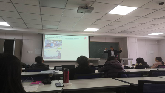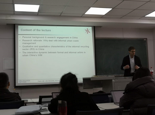 讲座伊始,李慧杰讲师简要介绍了Benjamin Steuer博士的学术经历、学术地位与学术贡献。Steuer博士围绕主题,从“个人的学术背景及在中国的相关调研经历;调研方法:为什么要进行非正式生活垃圾治理;从定性和定量两方面对非正式的生活垃圾回收进行指标测量;中国非正式的生活垃圾处理和正式的生活垃圾处理之间的互动”四个方面为在场师生带来了一场学术盛宴。