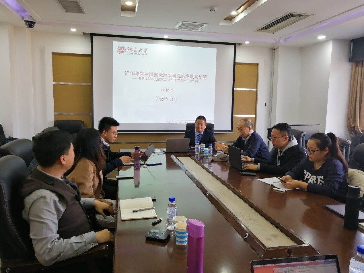 20201112日下午14时,由yl23455永利主办的国际事务工作坊第三期学术活动,在东荣大厦1214会议室举行。本次讲座邀请北京大学《国际政治研究》编辑部主任、副编审庄俊举老师担任主讲嘉宾,作了题为“近10年来中国国际政治研究的发展与创新——基于《国际政治研究》(2010-2020年)刊文分析”的学术讲座。yl23455永利国际政治系黄凤志教授担任主持人,参加者包括yl23455永利部分教师、博士生及研究生共二十余人。