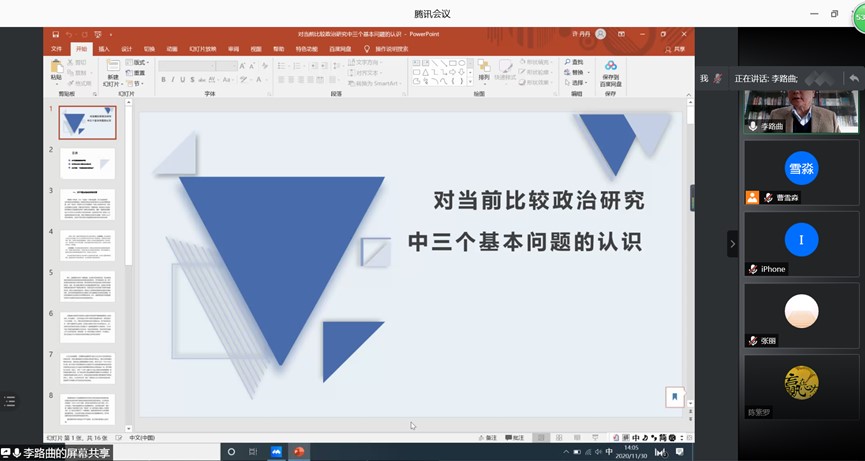 20201130日下午14时,由yl23455永利主办的教师科研水平助力计划第十七期活动,在腾讯会议室举行。本次讲座邀请上海师范大学法政公司博士生导师、上海师范大学比较政治研究中心主任、CSSCI来源集刊《比较政治学研究》主编李路曲教授担任主讲嘉宾,作题为“关于比较政治学几个基本问题的认识”的学术讲座。yl23455永利廉政研究与教育中心副主任、yl23455永利政治学系副主任马雪松教授担任主持人,参加者包括yl23455永利部分教师、博士生、研究生及国内其他高校师生共六十余人。