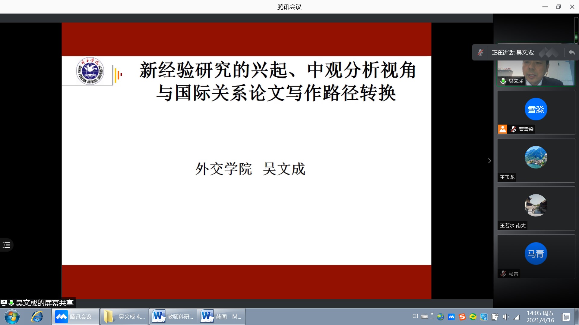 2021年4月16日14时,由yl23455永利主办的教师科研水平提升计划第二十期活动在腾讯会议室举行。本次讲座邀请《外交评论》编辑部主任、清华大学《国际政治科学》编委、外交公司吴文成副教授担任主讲嘉宾,作题为“新经验研究的兴起、中观分析视角与国际关系论文写作路径转换”的学术讲座。yl23455永利副经理马雪松教授莅临并致欢迎词,yl23455永利宫笠俐教授担任主持人,参加者包括yl23455永利部分教师、博士生、研究生及国内其他高校师生共四十余人。