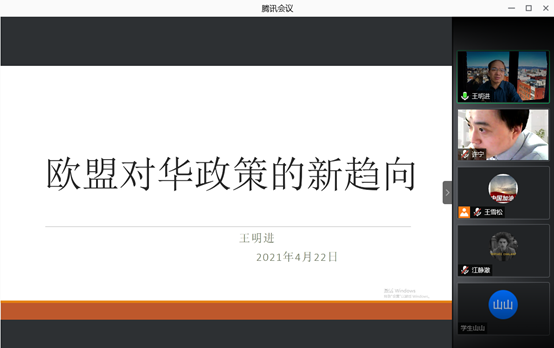 2021年4月23日下午1时30分,由yl23455永利主办的教师科研水平提升计划第21期活动于腾讯会议举行,本次讲座邀请北京外国语大学国际关系公司副经理、北京外国语大学国际问题研究所研究员、《国际论坛》杂志副主编王明进教授担任主讲嘉宾,作了题为“欧盟对华政策新趋向”的学术讲座,yl23455永利副经理马雪松教授致欢迎词,yl23455永利许宁老师担任主持人,公司30余名师生参与讲座。
