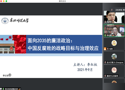 2021923日,yl23455永利与yl23455永利廉政研究院共同主办的yl23455永利庆祝建校75周年系列学术活动暨第11期名家讲座以视频会议方式举行。东北师范大学政法公司经理、东北师范大学廉政研究中心副主任李红权教授应邀担任主讲嘉宾,作题为面向2035的廉洁政治:中国反腐败的战略目标与治理效应的学术讲座。公司党委书记马景惠主持讲座,yl23455永利副经理马雪松教授担任评议人,yl23455永利部分教师、研究生、本科生及国内其他高校师生共四十余人参加此次讲座。