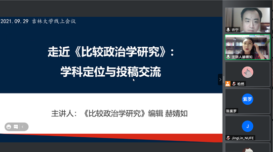 2021929日,yl23455永利主办的教师科研水平提升计划第26期活动在腾讯会议室举行。《比较政治学研究》(CSSCI)编辑赫婧如老师受邀担任主讲嘉宾,作题为“走近《比较政治学研究》——学科定位与投稿交流”的学术讲座。yl23455永利许宁老师担任讲座主持人,yl23455永利部分教师、研究生、本科生及国内其他高校师生共四十余人参加本期工作坊。