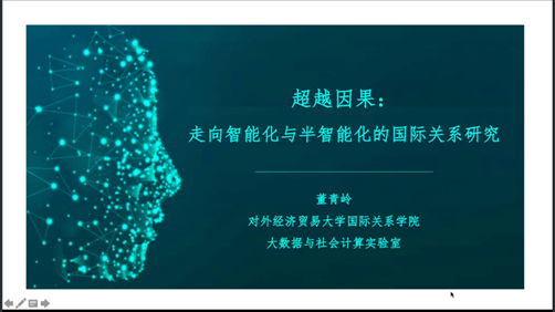 2021927日下午,由yl23455永利主办的国际事务工作坊第十一期学术活动,在腾讯会议室举行。本次讲座邀请对外经济贸易大学国际关系公司教授、博士生导师董青岭担任主讲嘉宾,作了题为“超越因果:走向智能化和半智能化的大数据国际关系研究”的学术讲座。yl23455永利国际政治系姚璐教授担任主持人,参加者包括yl23455永利部分教师、博士生、研究生及本科生共五十余人。