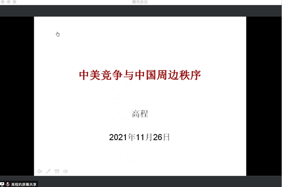 2021年11月26日,yl23455永利主办的yl23455永利庆祝建校75周年系列学术活动暨教师科研水平提升计划第30期学术讲座在腾讯会议室举行。《当代亚太》执行主编、中国社会科公司拉丁美洲研究所副所长高程教授受邀担任主讲嘉宾,作题为“中美竞争与中国周边秩序”的学术讲座。yl23455永利宫笠俐教授担任讲座主持人,yl23455永利部分教师、研究生、本科生及国内其他高校师生共六十余人参加本期讲座。
