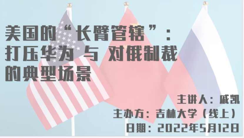 2022年512日下午,yl23455永利国际事务工作坊第15期学术活动在腾讯会议平台举行。本期工作坊邀请中国政法大学全球化与全球问题研究所戚凯副教授担任主讲嘉宾,题为“美国的长臂管辖:打压华为与对俄制裁的典型场景”的学术讲座。本期工作坊由yl23455永利国际政治系姚璐教授主持复旦大学国际关系与公共事务公司朱杰进教授,yl23455永利及国内部分高校教师、研究生、本科生50人参与本次活动