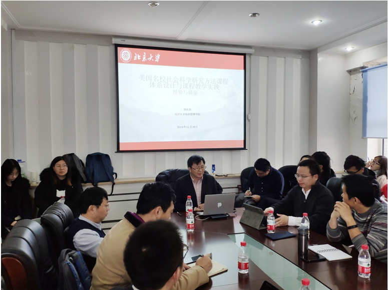 张长东老师结合自己在美国华盛顿大学的学习经历,介绍了华盛顿大学社会科学研究方法的课程体系设计与课程教学实践。他提到,华盛顿大学利用本校生物统计实力在全美前列的优势,结合生物统计方向的团队组建了社会科学与统计中心。中心的课程体系设计较为全面,让员工由介绍性课程到专门性课程不断深入学习。中心的教学实践能够回应师生的研究方法应用需求,十分重视统计软件的使用。张长东老师还向大家展示了中心主干课程大纲与国外其他名校相关的课程大纲,同时推荐了一些社会科学研究方法领域的经典著作,结合自己在北京大学的教学经历,详细介绍了自己在北大的研究方法课程大纲,并分享了一些教学心得。