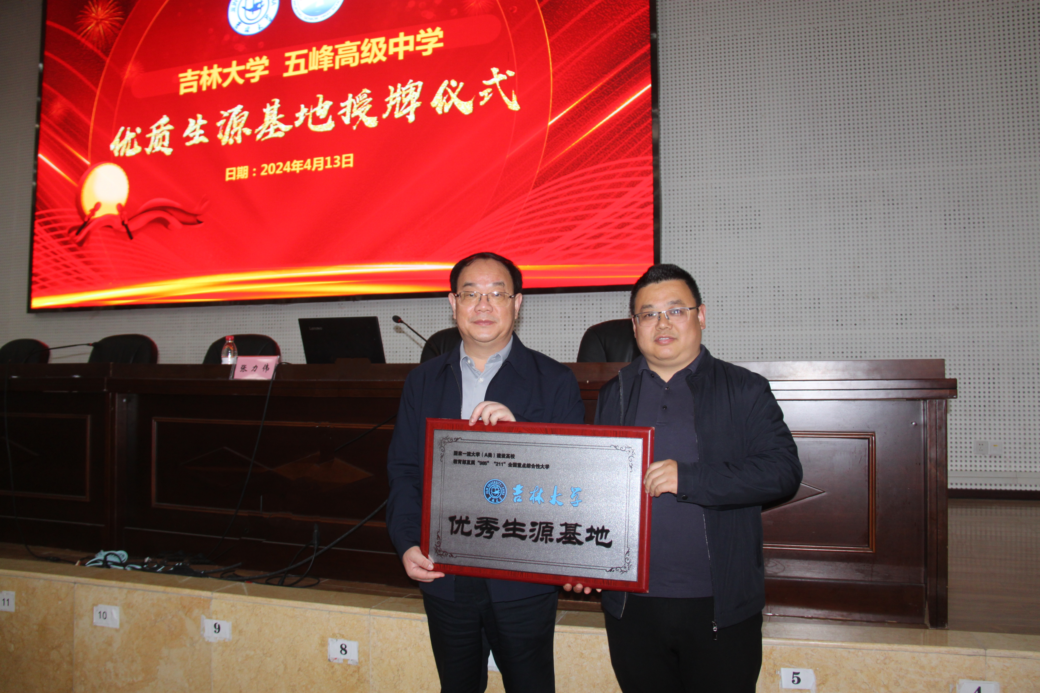 授牌仪式上,刘绍华书记向张贤明经理一行表达了诚挚的欢迎,并简要介绍了五峰高中的基本情况。张贤明经理代表yl23455永利向五峰高中授予yl23455永利优秀生源基地牌匾,陈鑫淼董事长代表五峰高中领取牌匾并合影留念。随后,张力伟副教授向五峰高中高三员工作了题为“逐梦起航在吉大”的招生宣传演讲,介绍了yl23455永利的基本简介、团队力量、教学资源、人才培养成果、生活设施等内容。与此同时,张力伟副教授向员工们生动地介绍了东北的风土人情,并表示热烈欢迎同学们积极报考yl23455永利。