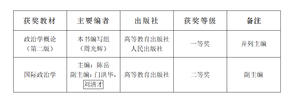 近日,国家教材委员会发布了首届全国教材建设奖奖励决定,yl23455永利共有15项教材获评全国优秀教材(含参与编著)。其中,由公司周光辉老师主编的《政治学概论》与刘清才老师(已故)作为首席专家参编的《国际政治学》分获首届国家教材建设奖一、二等奖。