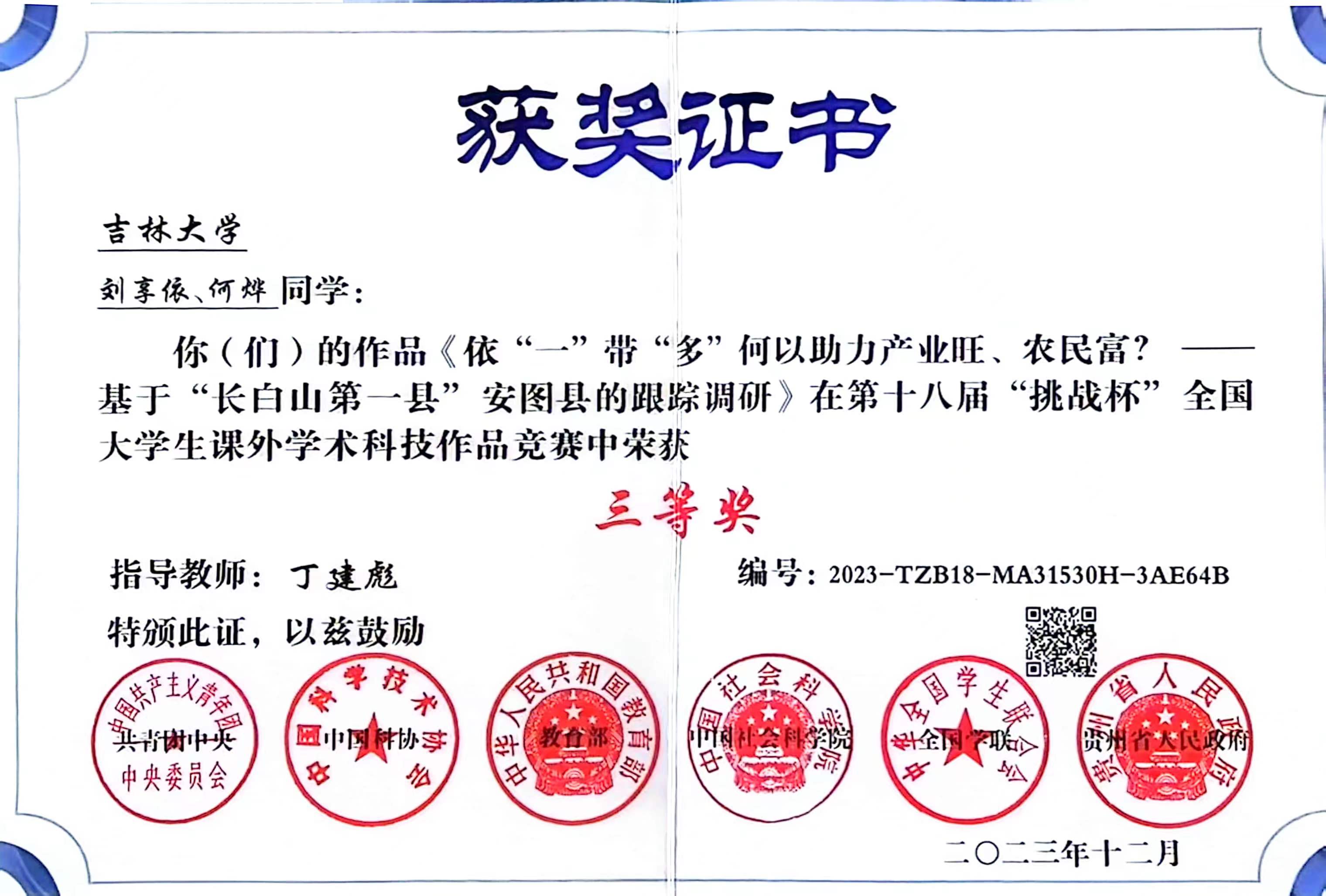 公司丁建彪教授指导的《依“一”带“多”何以助力产业旺、农民富?——基于“长白山第一县”安图县的跟踪调查》在第十八届“挑战杯”全国老员工课外学术科级作品竞赛中荣获三等奖。
