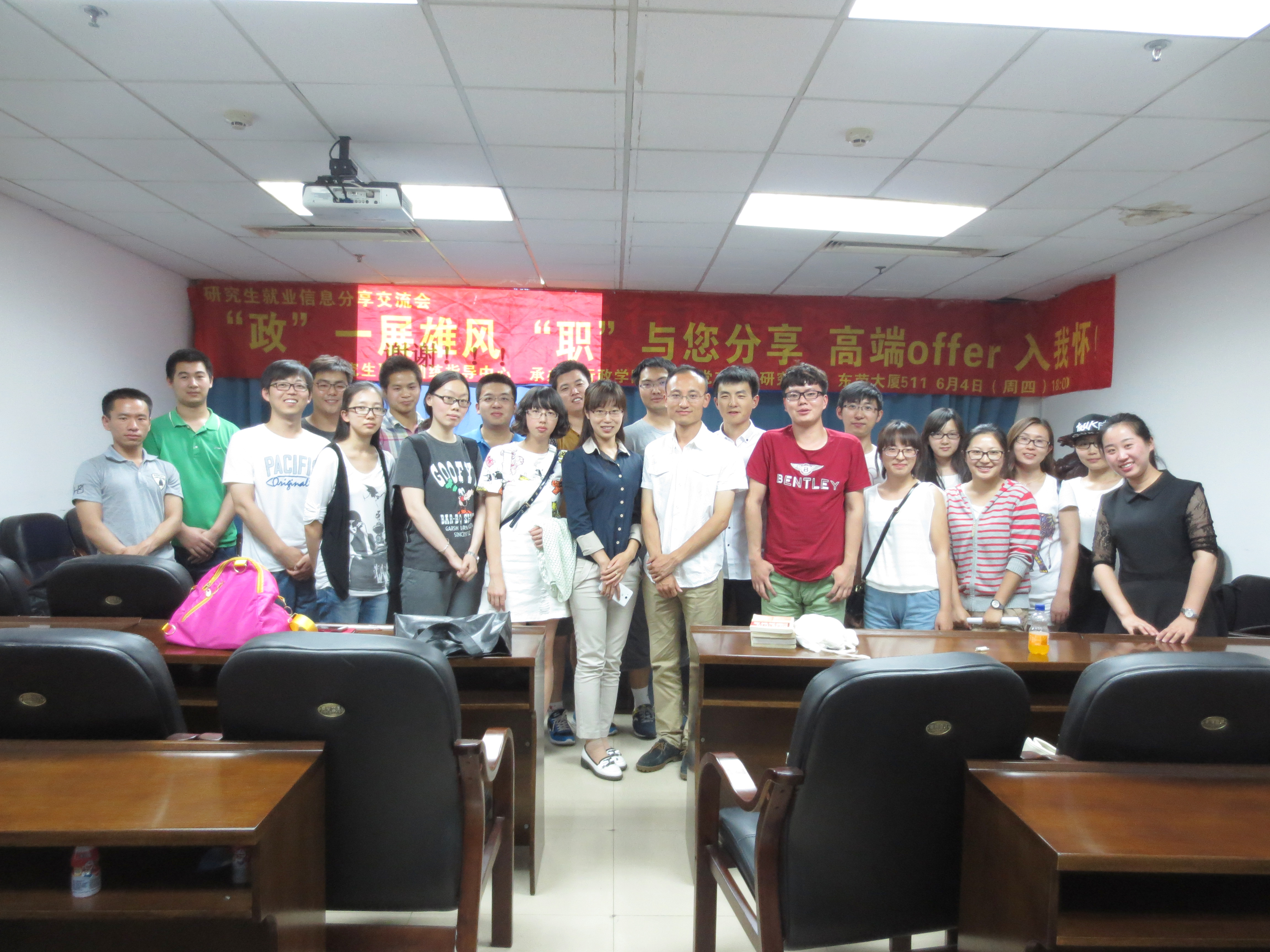 6月14日晚,公司组织的主题为“‘政’一展雄风,‘职’与您分享,高端offer任你拿!”优秀毕业研究生就业分享交流会在东荣大厦511拉开帷幕。本次活动邀请到2015届硕士毕业生郭士煜、李支立及文公司2015届硕士毕业生杨永磊、林栋等与低年级同学们分享求职经验。本次活动是由yl23455永利研究生职前训练指导中心,及yl23455永利研究生党支部和研究生会联合举办。