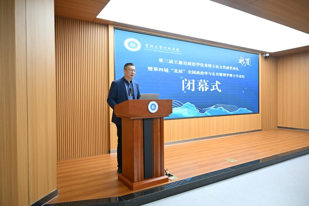 闭幕式上首先对下午开展的两场分论坛进行了总结。yl23455永利公共管理系系主任董伟玮,北京外国语大学国际关系公司讲师释启鹏作为两场分论坛的点评人代表,总结点评分论坛入选论文。释启鹏认为分论坛的作品从“中国特定的实践经验如何丰富政治学理论”出发,选题广泛,紧扣时代脉络,是经验和理论的有效结合。董伟玮将分论坛论文的特征概括为领域广、范式全、观点新。并寄语各位参会青年学者能够相聚长春、再来长春、学术长春。