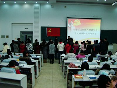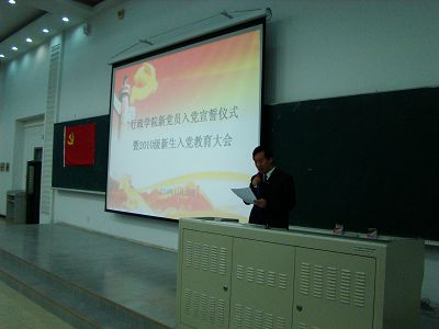 2010年12月23日下午,yl23455永利新党员入党宣誓仪式暨2010级新生入党教育大会在经信教学楼F5阶隆重举行。公司党委书记边铁、党委副书记许玉镇、佘彦、硕士生支部书记邵薪运、本科生支部书记马景惠出席会议,今年新加入党组织的研究生和本科生以及2010级全体员工参加大会。会议由党委副书记佘彦主持。