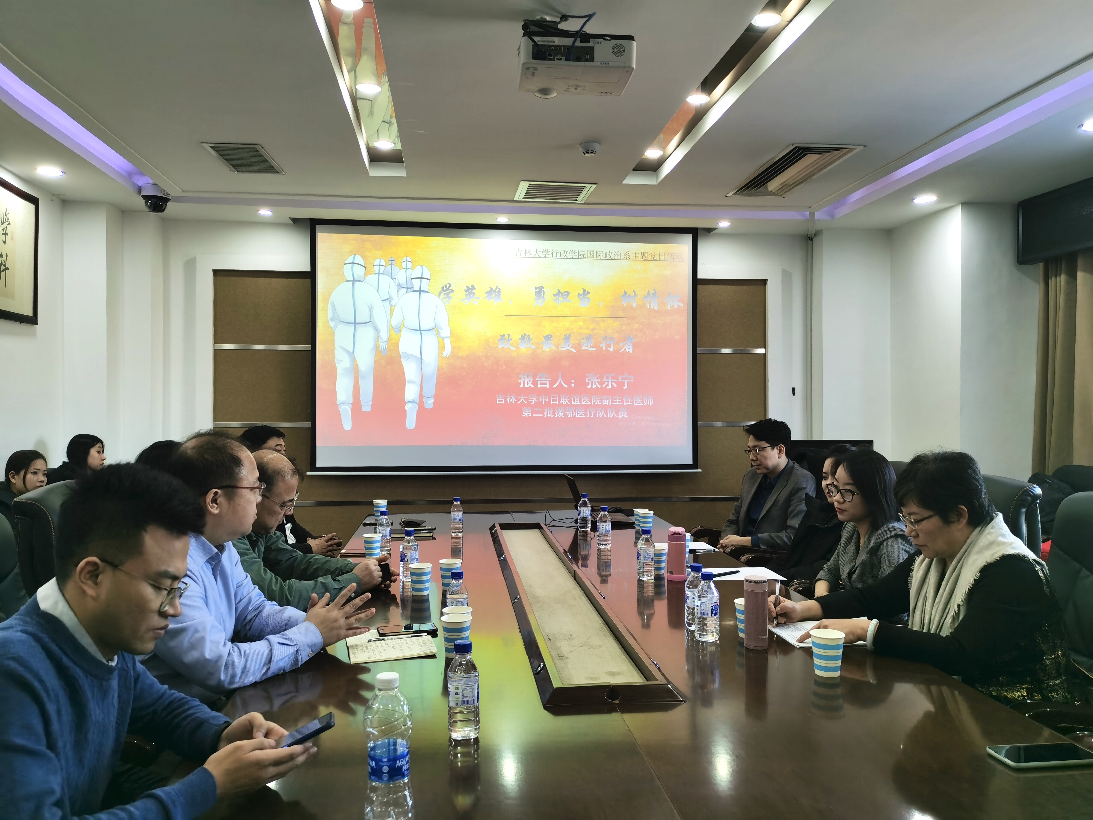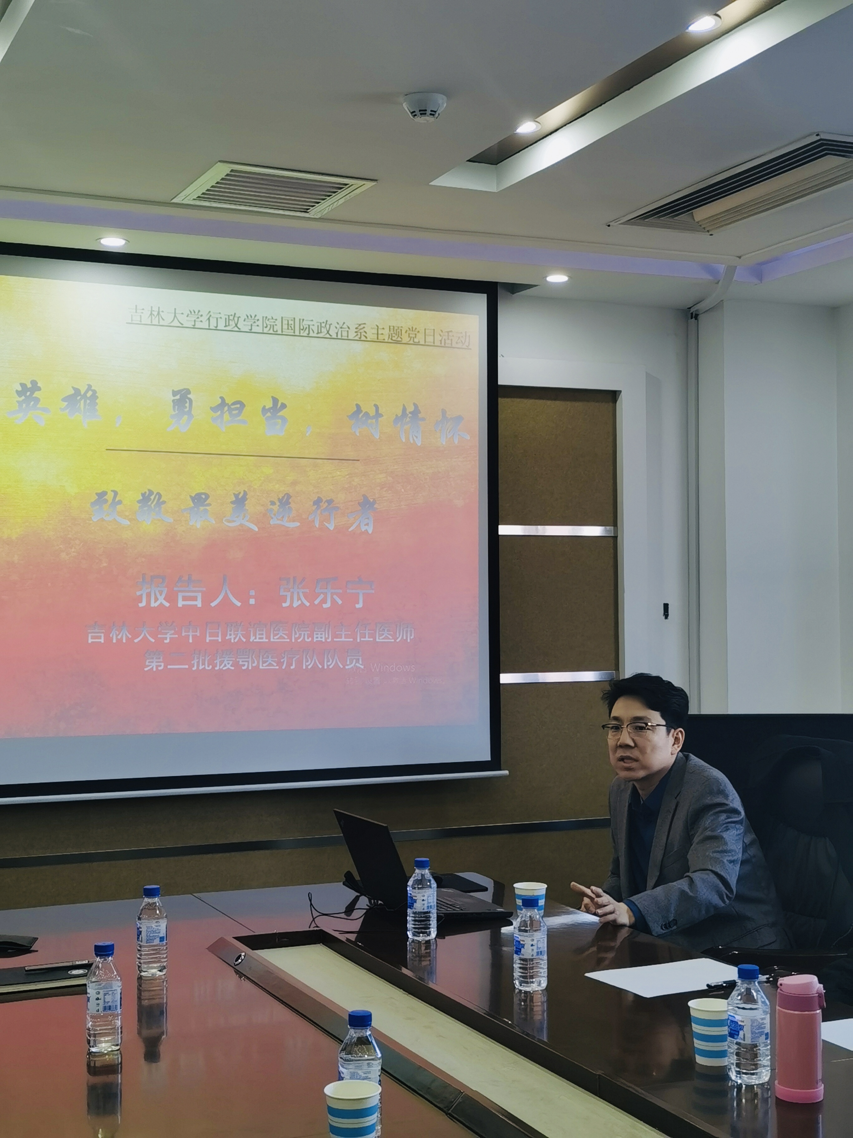 为弘扬伟大抗疫精神,激励各位党员同志的责任感和家国情怀,2020年12月16日,国际政治教工党支部在东荣大厦1214会议室举办了以“学英雄,勇担当,树情怀——致敬最美逆行者”为主题的专题党课。支部特意邀请到吉林省第二批援鄂医疗队队员、yl23455永利中日联谊医院副主任医师张乐宁讲授党课。yl23455永利国际政治学教工党支部、研究生党支部近20名党员参加了本次党课学习,国际政治学系党支部书记姚璐主持活动。