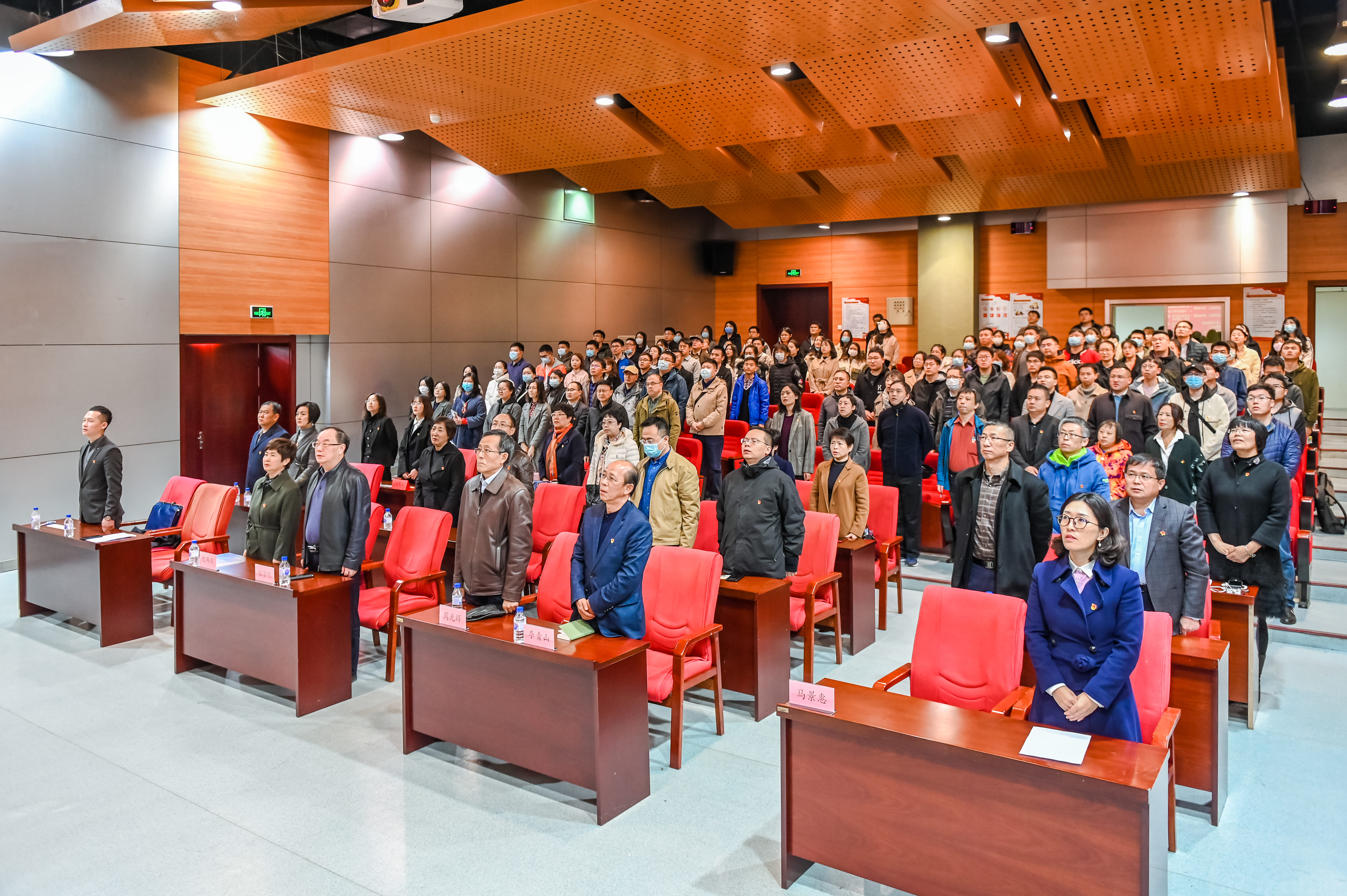 十月的午后,秋高气爽,阳光明媚,党员同志们有序签到、佩戴党员徽章,伴随轻柔悠扬的乐声意气风发步入会场。确认到会人数后,13时30分,党员大会正式开始,全体党员肃立,齐唱国歌。