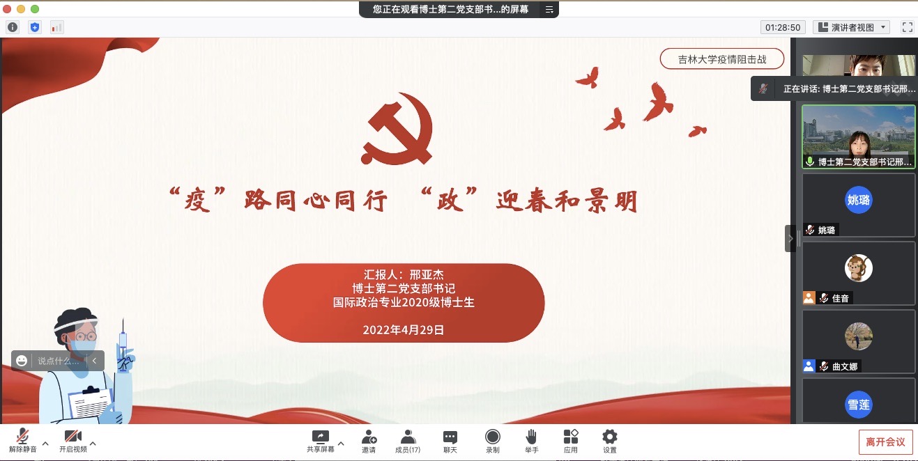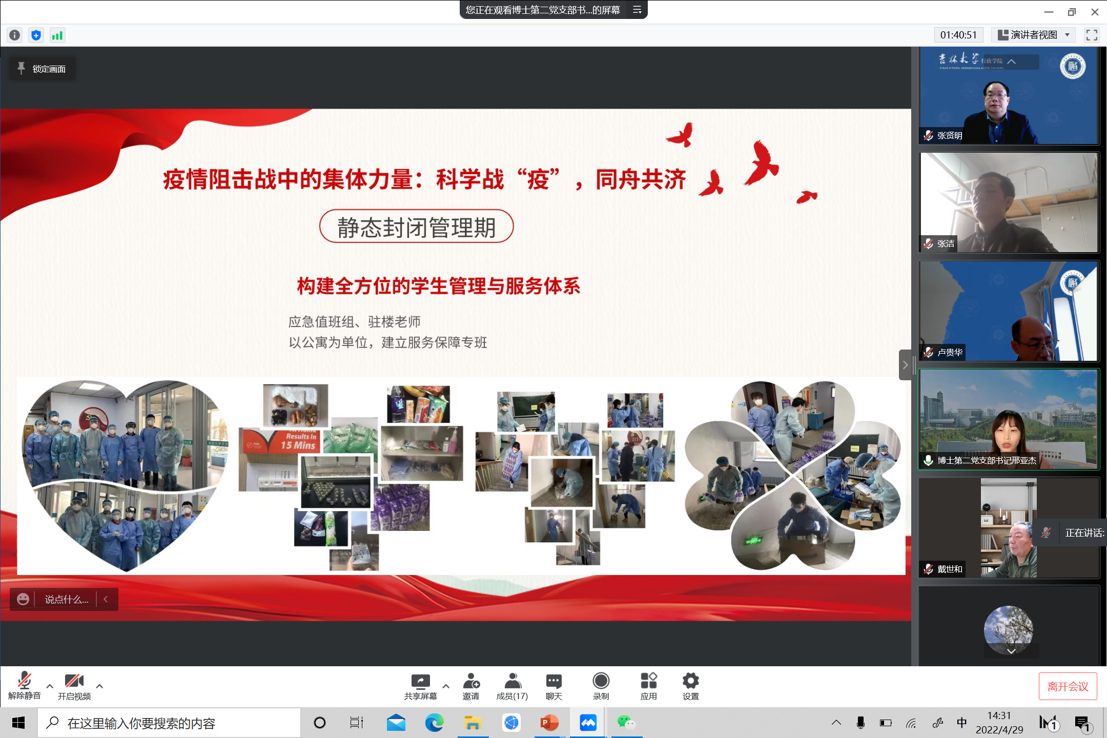 在前期自学的基础上,马景惠传达了公司疫情防控相关工作的最近精神。本科生党支部书记孙月、博士研究生第二党支部书记邢亚杰分别以《一心向党、科学防控,青年员工奋进新征程》《“疫”同心同行、“政”迎春和景明》为题进行代表发言。孙月表示,公司本科生党支部在公司党委的正确领导下,勇担责任、绽放青春活力,在理论学习、员工党支部建设、党团员作风建设、助力疫情防控等方面一以贯之、不断开拓,取得了较好成绩。邢亚杰表示,博士党支部有半数以上的同学奋战在志愿服务一线,临时党支部和党小组已自行组建起“责任区-先锋岗-突击队”的工作梯队,员工自我管理与服务体系健全完备。