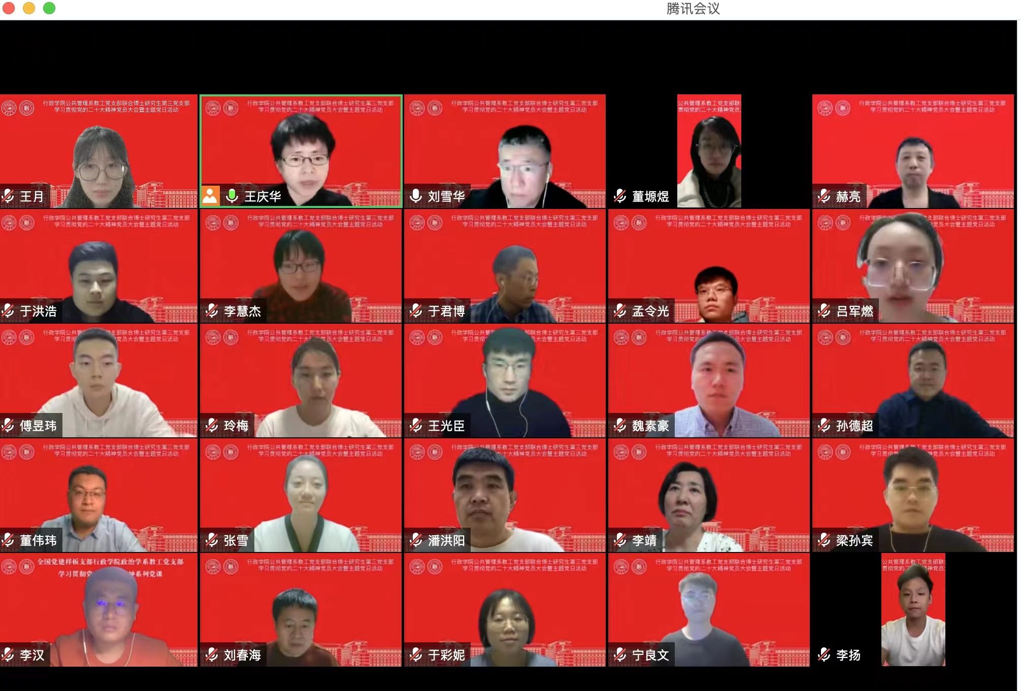 为深入学习领会党的二十大精神,加强党建引领学术创新,2022年11月10日,yl23455永利公共管理系教工党支部联合博士员工第三党支部开展“学习贯彻党的二十大精神”党员大会暨主题党日活动。公共管理系党员教师、非党员教师、博士研究生第三党支部全体党员和积极分子在内的40余人参加会议,会议由公共管理系教工党支部书记王庆华同志主持。