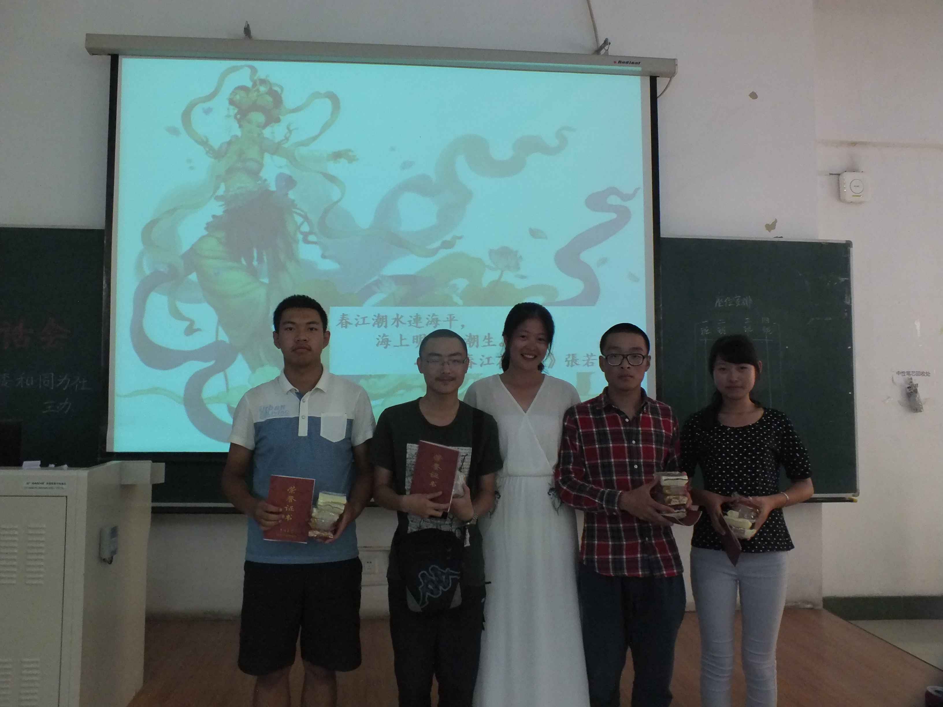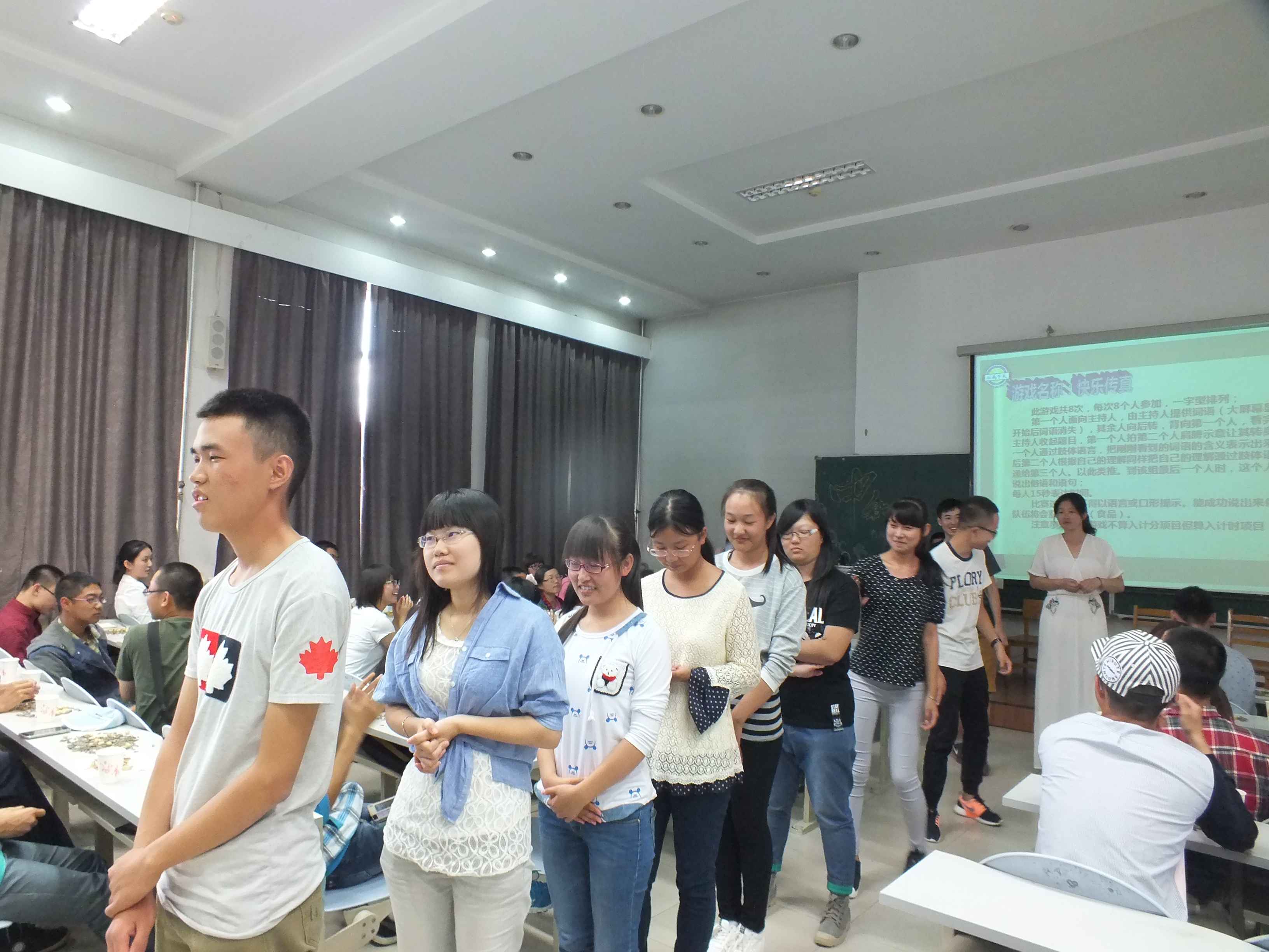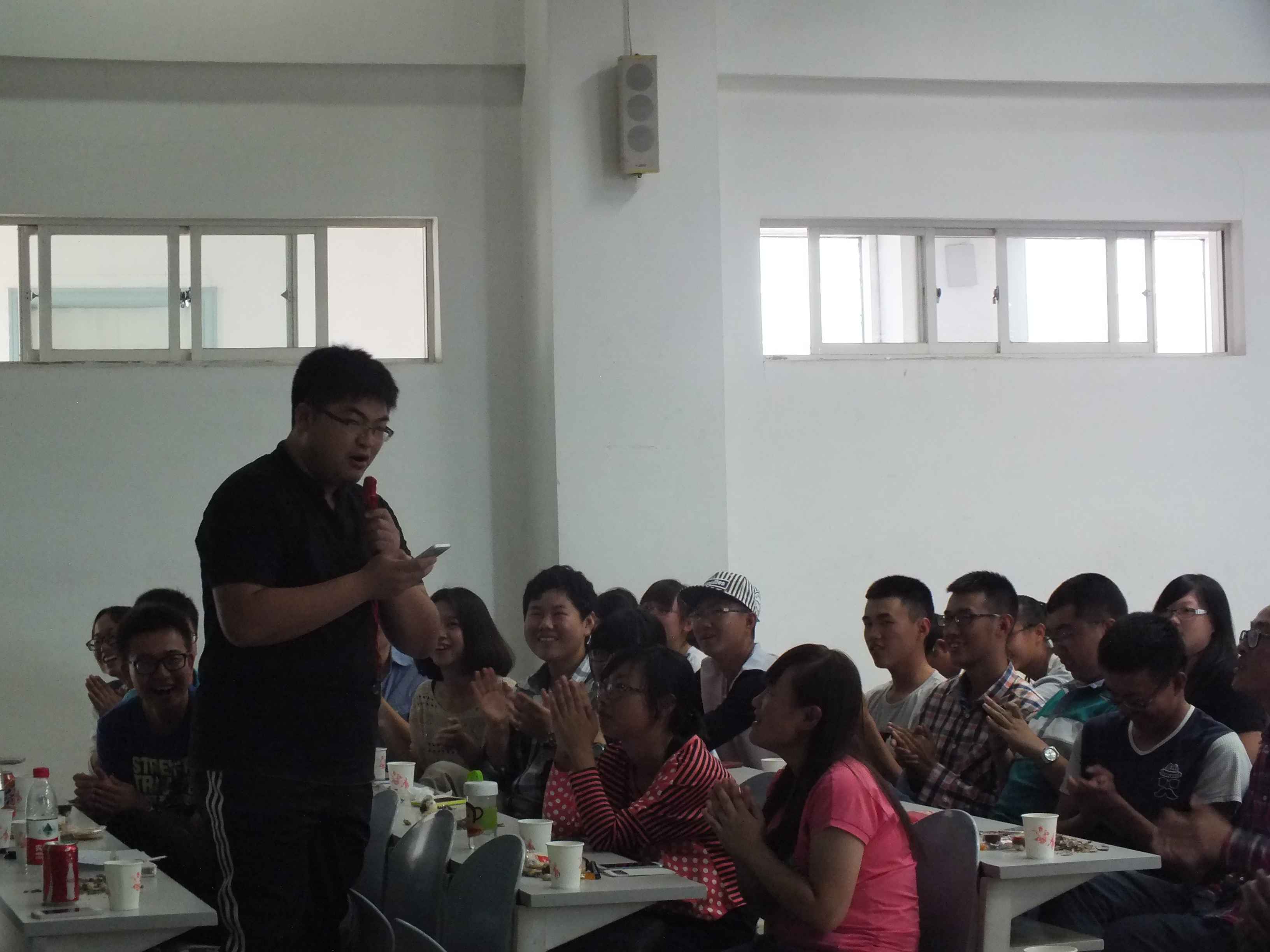 中秋茶话会主要以游戏的方式进行,共设置了“快乐传真”、“歌曲接龙”、“微信摇一摇”、“你来比划我来猜”和“谁是卧底”等五个游戏环节。在游戏环节中,同学们优美的歌声、动感的舞蹈,诙谐的表情、夸张的动作使得茶话会现场掌声不断、笑声不息。在场师生不时互动游戏,让大家充分体会到了行政大家庭的温馨与欢乐。游戏过后,辅导员刘洋、曲畅竹与2012级同学共同演唱一曲《但愿人长久》,将中秋佳节的美好祝愿送给大家。之后,刘洋与曲畅竹分别为获奖班级颁发奖状与纪念品并合影留念。在茶话会的最后,曲畅竹致辞,她希望每位新生能把yl23455永利当作自己的家,在行政大家庭中健康快乐地成长,并祝大家中秋快乐。