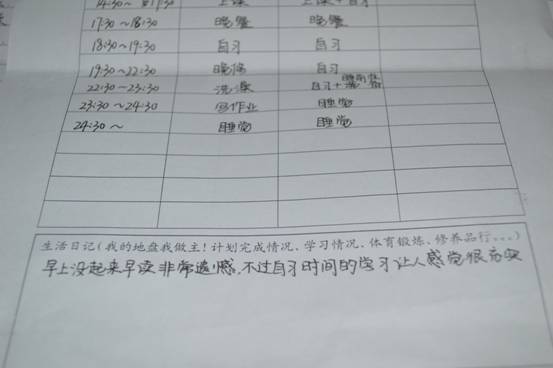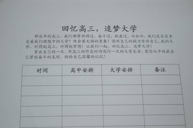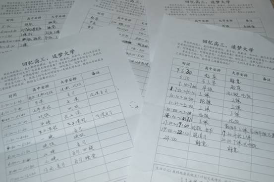 活动以作息时间表为载体,要求同学们用高三的作息时间安排一天的老员工活。12月5日,班委为同学们分发了作息时间表,并鼓励大家做好计划,用自己的毅力坚持一天紧张而充实的老员工活。12月6日晚,班委同学对同学们的计划完成情况进行了调查,并收集了部分同学的计划安排表。在调查过程中,一位同学说:“前些天,我越来越觉得我的老员工活对不起高三,这次活动我很认真的做了,一天过得比较充实。而且不断回想着自己高三的日子,想起了以前的老师和同学们,很怀旧,很幸福。”