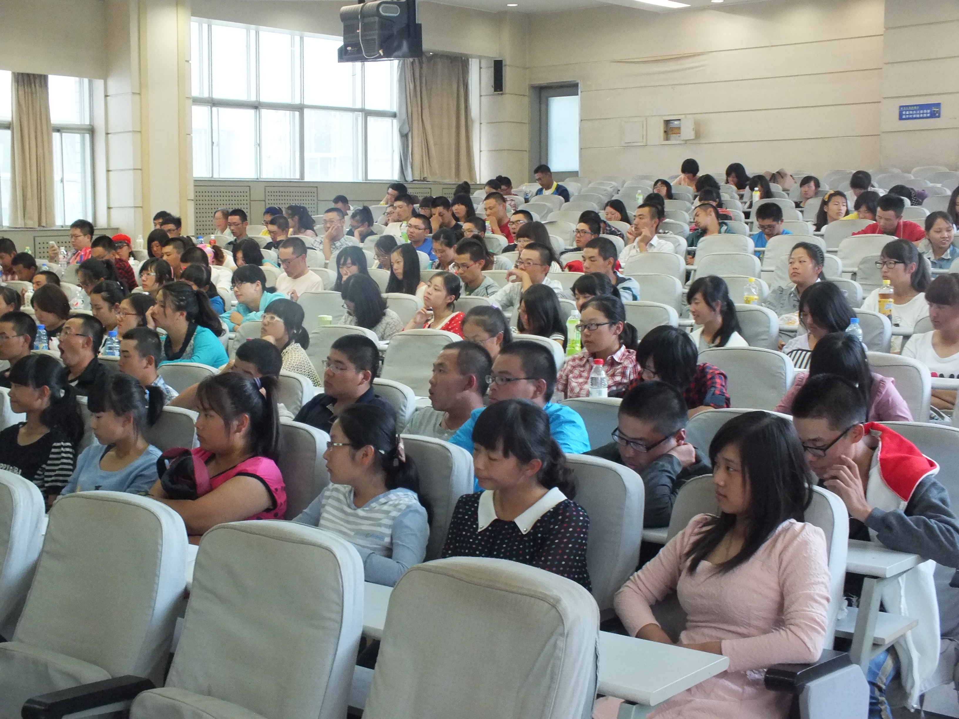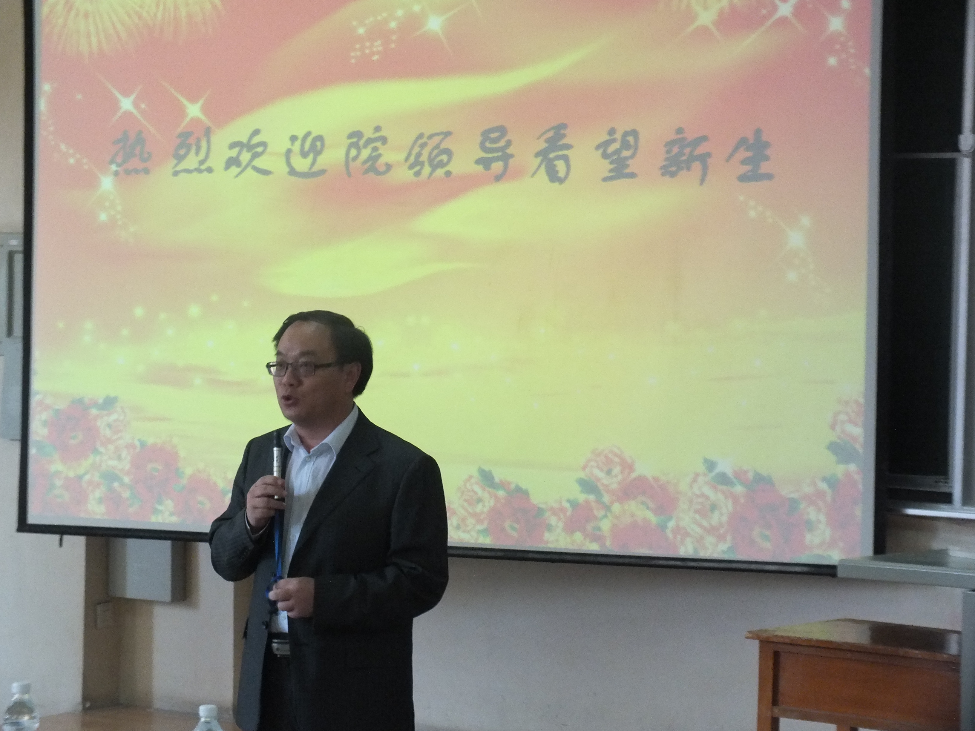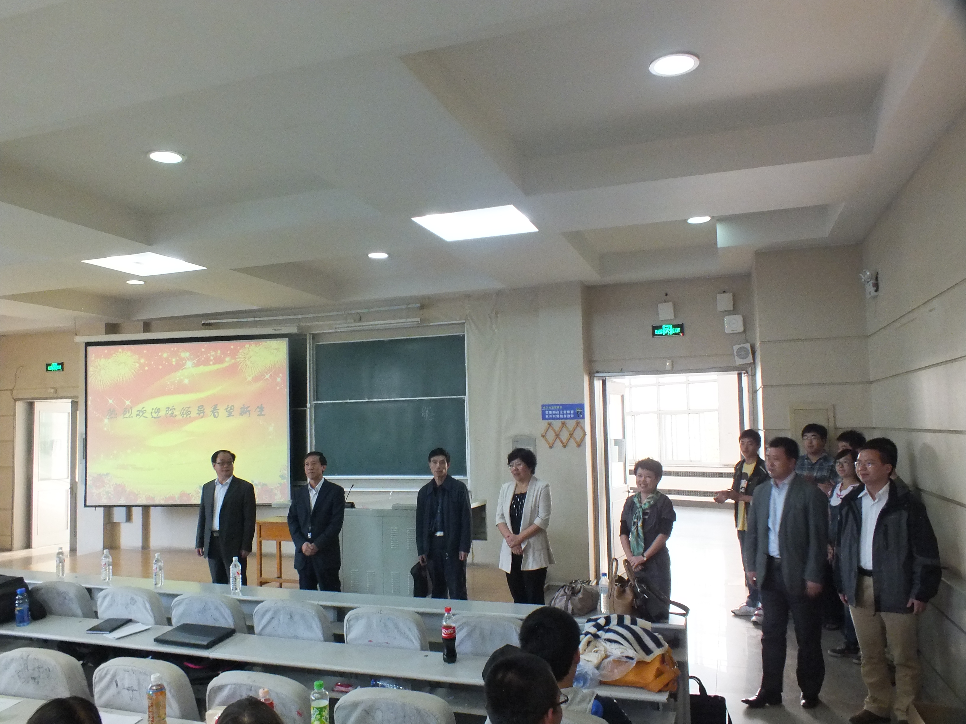 9月12日下午四时,公司党委书记边铁,经理张贤明,党委副书记常有余,副经理刘雪莲、许玉镇、殷冬水、范斌等公司领导在本科生辅导员刘洋和助理辅导员吴兴识的陪同下来到逸夫教学楼第三阶梯教室看望刚刚参加过入学典礼的全体2013级新生。