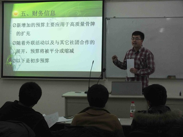 为贯彻落实校团委关于开展yl23455永利2013年“每团一品”活动的工作要求,遴选出院内最具影响力的精品员工活动,全面总结员工社团2012年工作情况,12月3日晚6时,yl23455永利团委社团部于中心校区逸夫教学楼MPA教室成功举办了2013年“每团一品”活动院内申报答辩会。yl23455永利助理辅导员刘洋,团委副书记董华荣、金武泽,团委社团部部长张孟歌应邀出席并担任评委。社团部全体成员及yl23455永利外语协会、ICU模拟联合国协会、海化社、思潮学社、同为社、农村发展研究会、政能量志愿者协会的主要负责人参加了此次活动。本次答辩会由团委社团部副部长李亚楠主持。