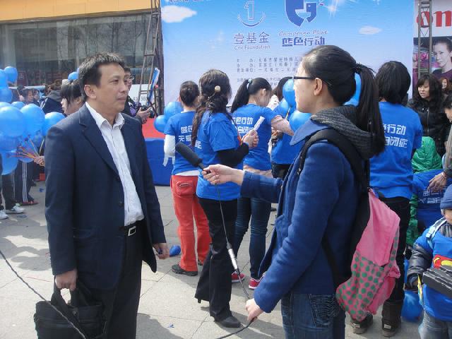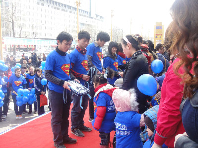 4月2日,星光志愿服务队同学早早来到长春市红旗街百脑汇门前的“放飞梦想”活动现场,悬挂蓝色宣传条幅、发放自闭症日宣传单、散发蓝色气球,快乐地忙碌着。自闭症儿童及其家长们来到活动现场,其家长代表表达了对公司志愿者一直以来对自闭症儿童的志愿服务的感激之情,名叫渺渺的自闭症男孩演唱《北京欢迎你》表达对志愿者的感谢,公司志愿者也为孩子们送上精心准备的学习用品。