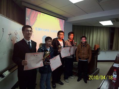 大赛由牟明标、李冰主持,yl23455永利团委书记马景惠老师、团委副书记田治琛及团委各部部长出席了大赛并担任评委。大赛首先播放了开场短片,紧接着展播了09级四个班的参赛作品,分别是一班的《青春记忆》、二班的《王牌制片人》、三班的《情系西南》和四班的《坚强的心》。各班的作品以自身独特的风格、别具匠心的设计给在场的观众带去了快乐、感动和反思。接下来进行了一场配音游戏。游戏参赛者诙谐的表演增添了大赛轻松融洽的气氛。经过激烈的角逐,最终评出了四项团体奖 ——一班荣获最佳视觉效果奖 ,二班荣获最佳化妆(服装)奖,三班荣获最佳原创剧本奖,四班荣获最佳影片奖;六项个人奖—最佳男主角:刘洋,最佳女主角:洪桑桑,最佳男配角:王宏伟,最佳女配角:唐馨h,最佳导演:牟明标,最佳剪辑:李诗。最后,由团委副书记田治琛做最后总结。