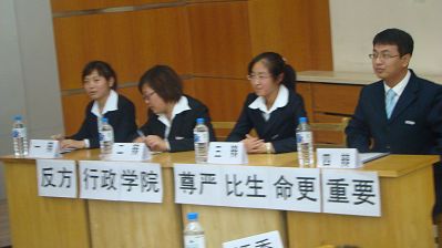 2008年10月18日晚,公司迎来了校“先锋论坛”辩论赛的首场比赛。公司对阵传统强队哲学社会公司辩论队,就尊严和生命的重要性问题展开讨论。我方作为反方,观点是“尊严比生命更重要”。首场比赛中我们获得了胜利,顺利晋级。