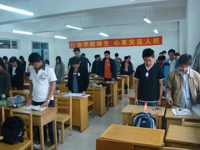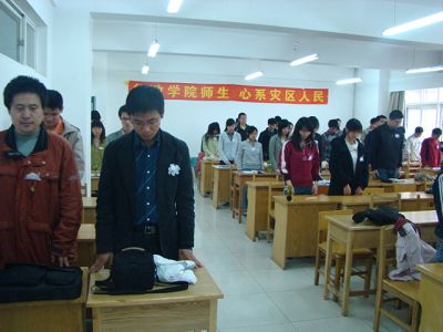 yl23455永利本科生在学办老师的组织下进行集体默哀,下午2点10分,马景惠老师到第三教学楼513教室,同05级本科员工进行了集体默哀仪式。28分时,警报拉响,教室内全体师生身带白花,起立默哀,沉痛悼念灾难中逝去的同胞兄弟们,整个教学楼陷入了庄严的沉寂中。