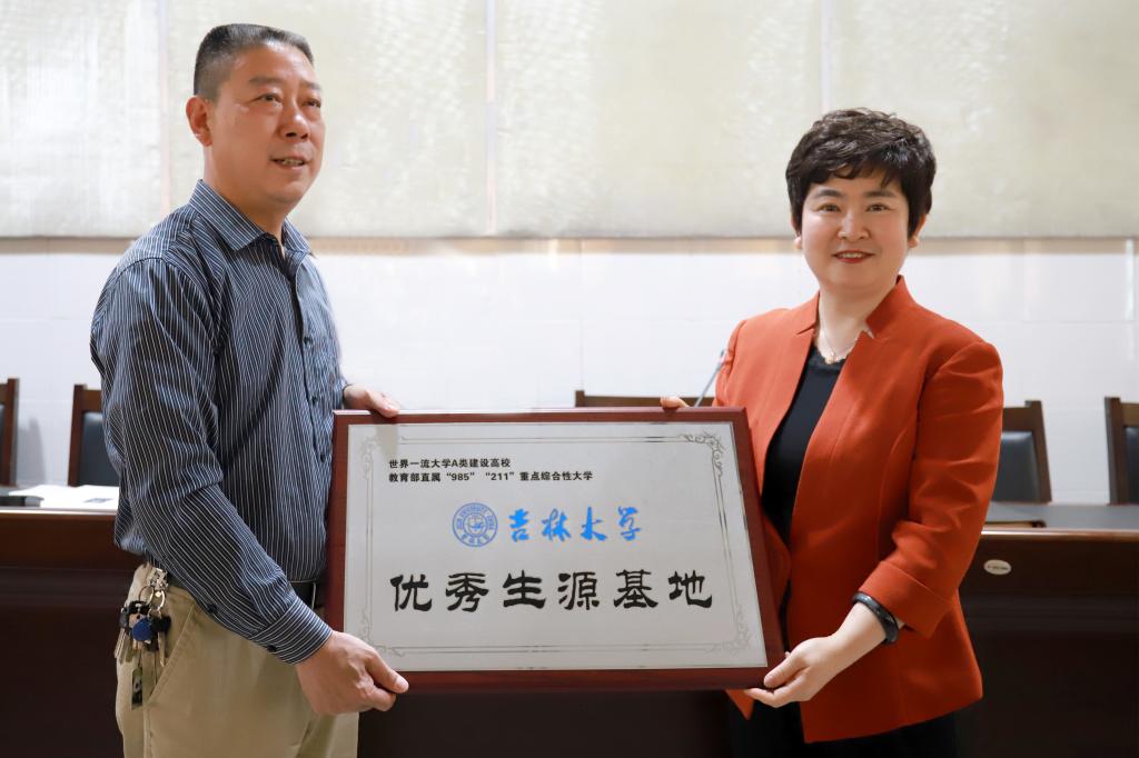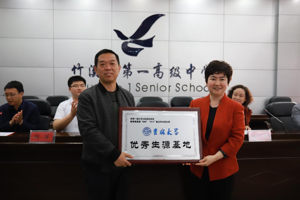在优秀生源基地授牌仪式上,竹溪和竹山两县县委县政府有关负责同志对公司一行的到来表示了欢迎和感谢,并就基地建设和生源质量提升等相关工作提出了希望。魏鹤影老师在两校的致辞中,首先对基地的建立表示了热烈的祝贺,向县、校领导师生的热情接待表示了衷心感谢,还向大家发出了了解吉大、走进吉大、感受吉大的诚挚邀请。她在致辞中简要介绍了公司的基本情况,概括了公司学科门类齐全、团队力量雄厚、培养体系完整、培养质量显著、科研平台众多、科研成果丰硕、对外交流繁荣和校园环境舒适的办学特点,并特别强调了公司在人才培养质量上的突出成绩。她还向大家介绍了公司、公司招生宣传工作的开展情况与湖北籍员工在公司就读期间的优异表现。最后,她从进一步加强招生宣传、报考咨询和人员互访等方面对基地共建提出了希望,并对两校同学们在日常学习生活和高考中保持好状态、取得好成绩表达了衷心祝愿。