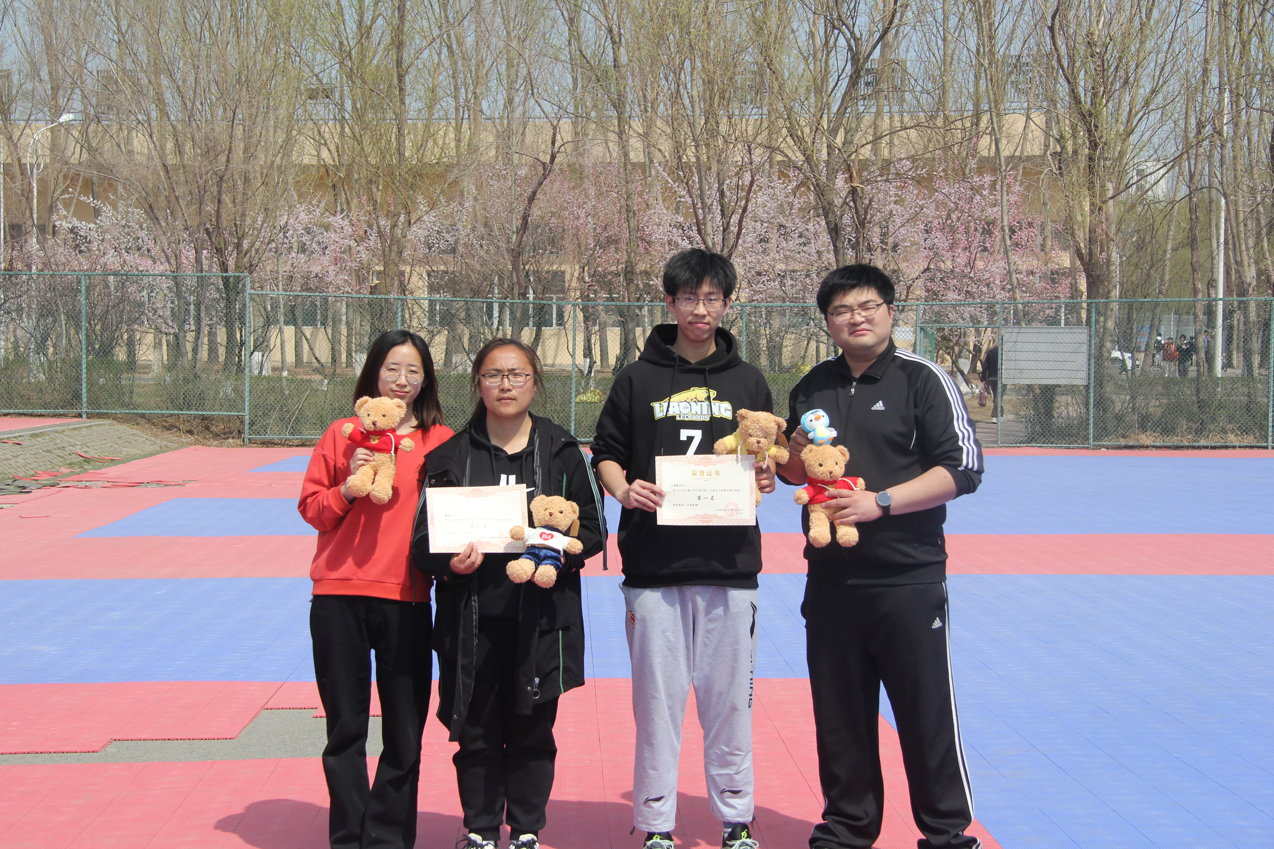最后一个比赛日,进行了定点投篮比赛。男子组有5名同学和刘洋老师参与比赛,江禹熹(2019级本科生)获得第一名;女子组共有4名同学参加比赛,柴敏(2020级本科生)获得第一名。比赛结束后,高琛老师、刘洋老师和孙月老师为获奖队伍和个人颁奖并合影留念。