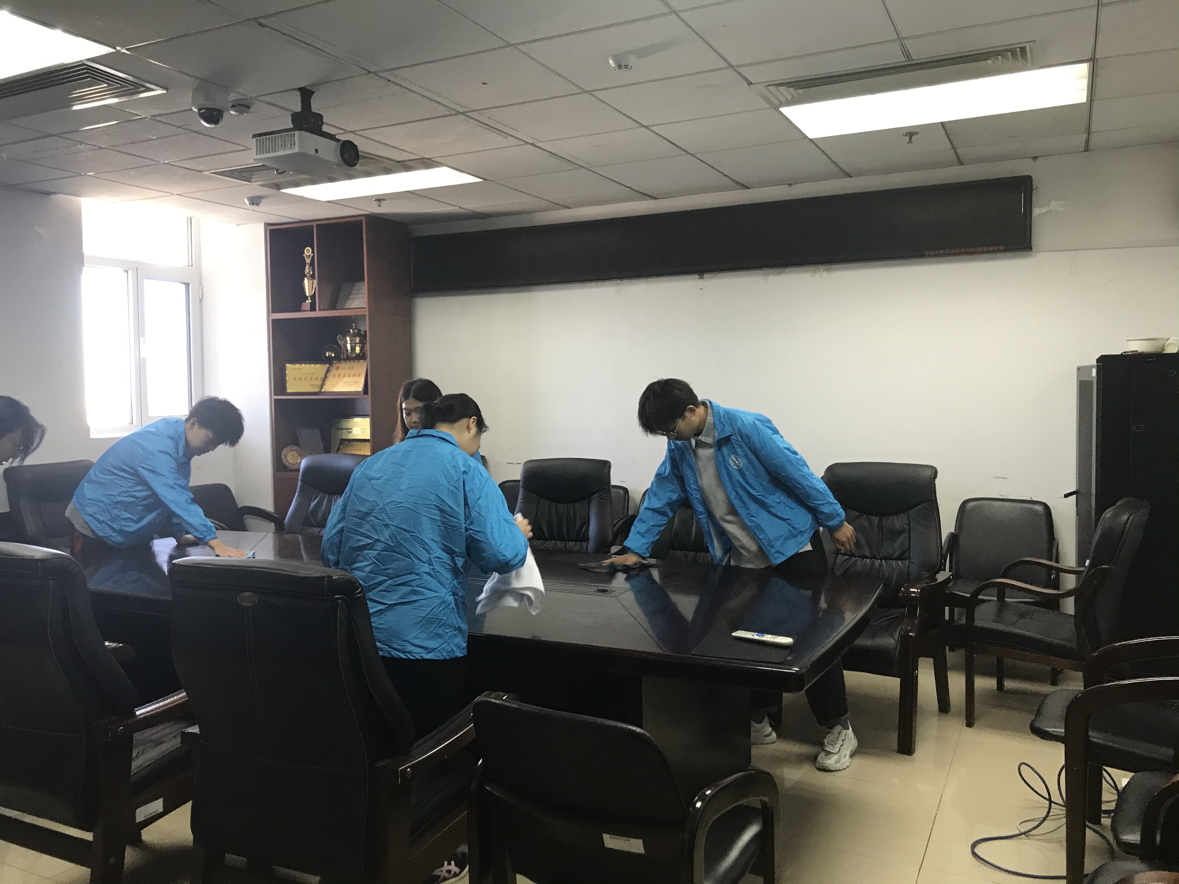 紧接着,同学们转步到东荣大厦12楼,组织进行劳动实践教育,细致清扫公司办公室、储物室和会议室等办公区域,擦拭会议桌,储物架及过往获得的荣誉奖杯,整理迎新活动的备用物品及未来活动道具,在擦拭整理中重温公司过往。活动结束后,同学们进行思想交流,在总结收获中坚定理想信念。