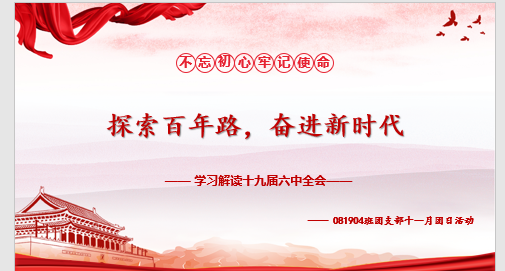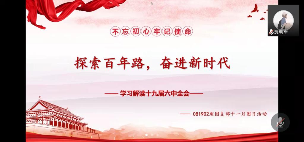2021年11月8日至11日,在“两个一百年”奋斗目标历史交汇的关键节点,党的十九届六中全会胜利召开,全面总结了党的百年奋斗重大成就和历史经验,深刻揭示了“过去我们为什么能够成功、未来我们怎样才能继续成功”的历史启示。为深入学习党的十九届六中全会内容,深刻贯彻落实会议精神,在院团委的指导下,2019级各班团支部开展了主题为“探索百年路,奋斗新时代,聚焦十九届六中全会”的团日活动。
