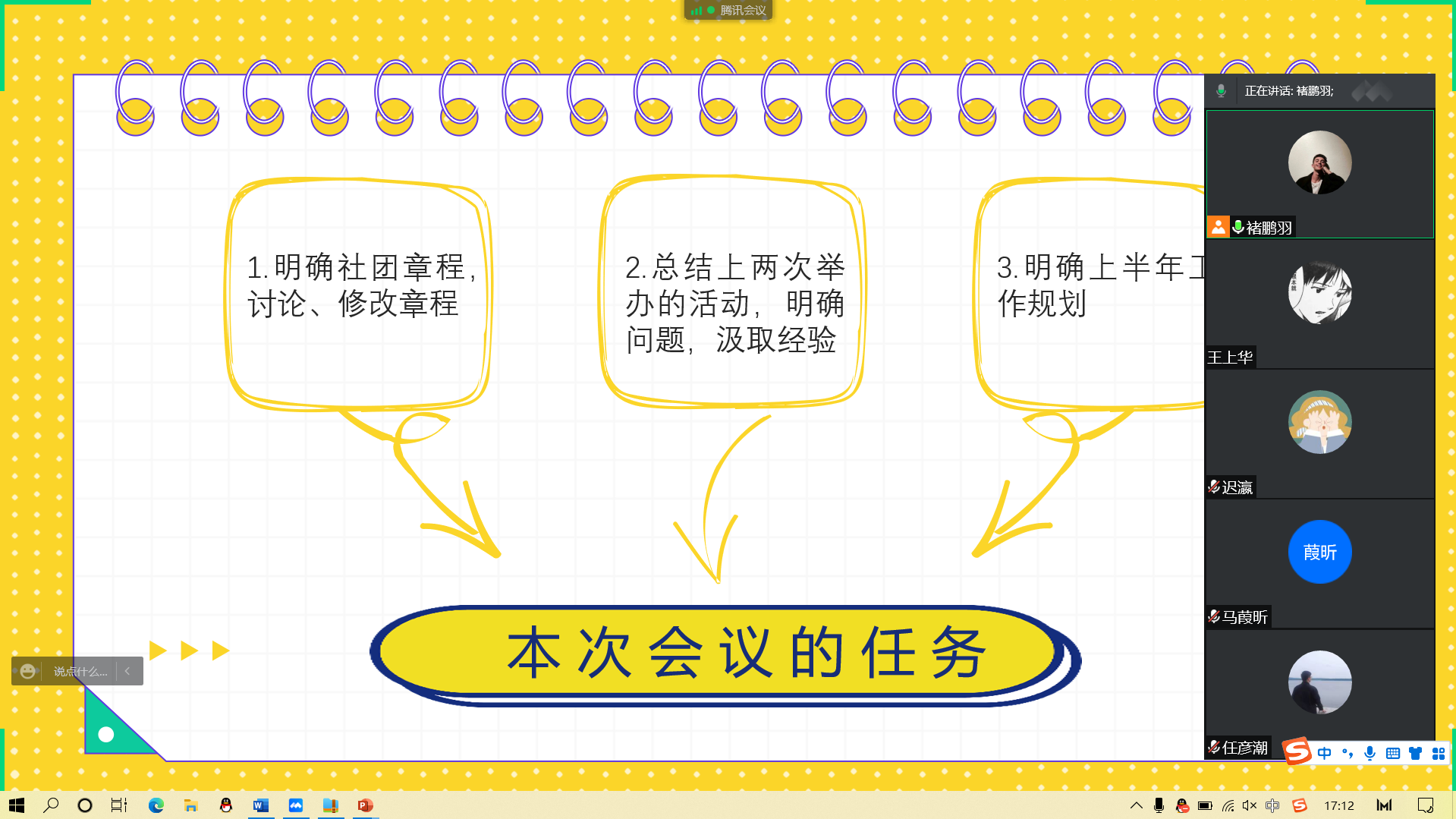 为明确社团章程,提升执行团成员工作效率,3月7日下午,政能量志愿者协会举办2022年第一次社团例会。例会采取线上线下结合的方式,5名执行团成员参会。