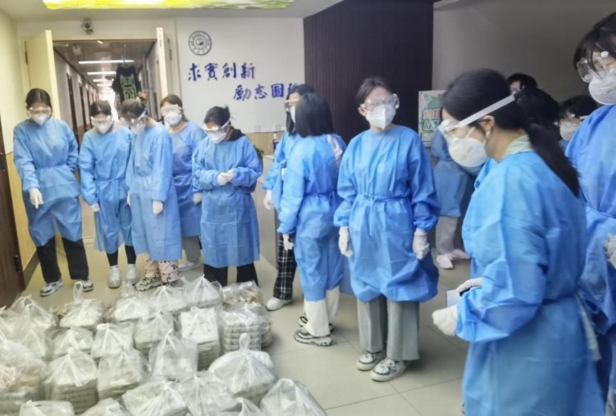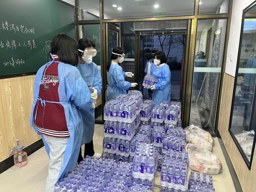 晨光尚未穿过黎明之时,她们已全副武装地下楼,轻轻地将丰盛的早餐放在寝室门口;她们披着月色回寝,厚重的防护服下,是被汗水浸湿地衣衫。李垣欣(2021级本科生)介绍道:“志愿工作大概分为两部分,一部分是负责分发餐饮食物与防疫物资的“配送员”;另一部分则是配合楼层长工作,搬运分发防疫物资,统筹管理与记录物资流动。”志愿者的工作往往伴随着辛劳与汗水,她们要将沉甸甸的物资搬向高层,穿戴着口罩与防护服工作加重着她们晕眩与疲惫感,但她们迎难而上、默契协作,完成了一项项志愿服务工作。“我们采用“流水线”的方式解决向高楼层搬运的难题!”盛佳宜(2021级本科生)这样描述她的志愿经历,“交接时默契配合、相互体谅,大家齐心协力最终让一切工作水到渠成。”