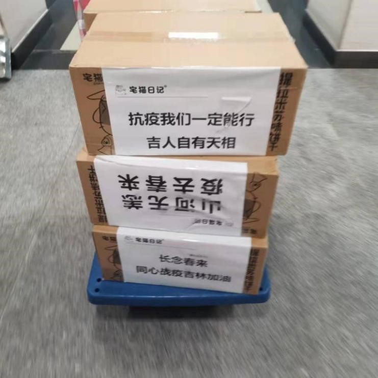 8:40,公司员工捐赠的食品到达公寓,志愿者们同样快速下楼集合,搬运分发物资。“抗疫我们一定能行”“吉人自有天相”“山河无恙,疫去春来”“长念春来,同心战疫吉林加油”——包装箱上的话语饱含美好祝愿,暖流跨越山海,此情地久天长。