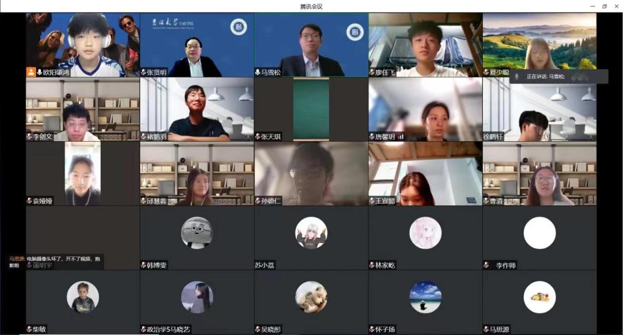 4月8日晚,班主任张贤明和马雪松两位老师与2020级一班共同开展了第四期线上班会,本次班会的主题为介绍家乡。两位老师首先针对同学们疫情防控下的心态调节问题进行了关心和询问,班长欧阳肇鸿大致讲述了最近的封寝生活状况和近期饮食上的菜品质量,并表达了希望尽快解封的心情。廖任飞、欧阳肇鸿、蒲明宇三位同学分别从家乡别名、历史故事、家乡美食等层面入手,介绍了四川、湖南、青海等地,为大家呈现出了壮美秀丽的祖国河山。马雪松老师在点评中简述了对人文风俗的见解,强调了四川人说话绘声绘色、鲜明生动的特点,并且与大家分享了他心中的乡土以及乡风乡韵的欣赏。最后,张贤明老师分享了自己与各省的一些故事,并表达了希望走遍祖国大好河山的美好愿望。同时,张老师建议同学们“读万卷书,行万里路”,要多体验其他地域的风土与人情。