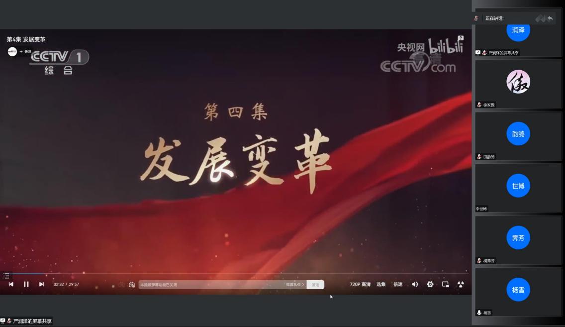 第一环节,与会同学共同观看《领航》纪录片第三集《逐梦先锋》、第四集《发展变革》。第三集《逐梦先锋》聚焦展现以习近平同志为核心的党中央坚持和加强党的全面领导,充分发挥党总揽全局、协调各方的核心领导作用,深刻反映坚持党的全面领导是党和国家的根本所在、命脉所在,是全国各族人民的利益所在、幸福所在,是实现中华民族伟大复兴中国梦的根本保证。第四集《发展变革》聚焦展现以习近平同志为核心的党中央坚定不移贯彻创新、协调、绿色、开放、共享的新发展理念,推动我国发展在危机中育新机、于变局中开新局,深刻反映我国经济发展取得新的重大成就,迈上高质量发展之路。