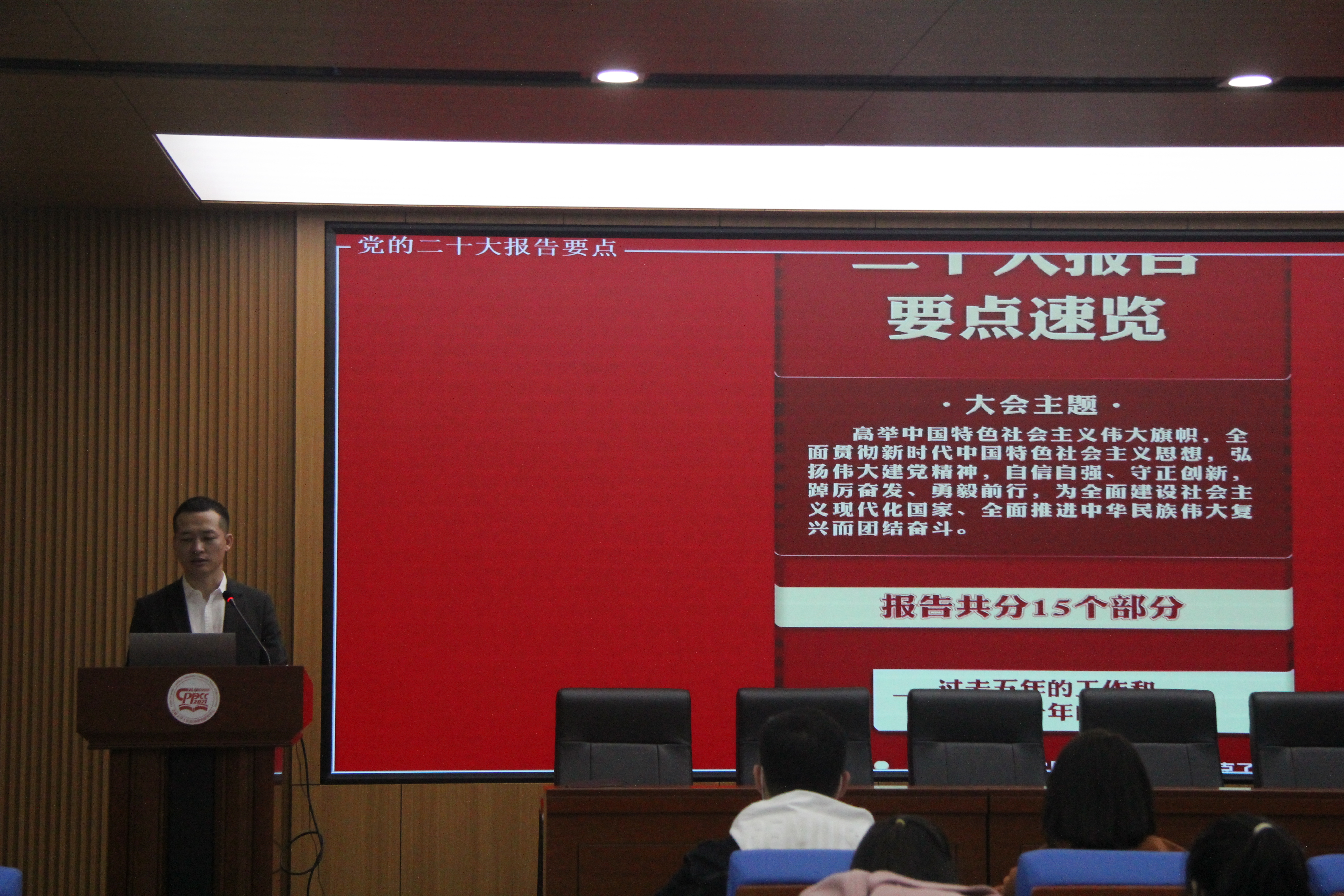 张洁在会上主讲党课,带领全体本科生党员、发展对象共同学习党的二十大精神。张洁介绍了习近平总书记同其他51位党和国家党员领导同志作为党中央提名的代表候选人全部当选党的二十大代表情况,分析了二十大代表结构比例,展示了中央政治局等新一届中央领导机构组成情况,细数党的二十大报告从起草、讨论重大理论和实际问题、听取意见建议、确定框架结构到修改、定稿的诞生过程,逐条回顾了党的二十大报告要点和新提法,着重对比了党的十七大以来大会工作报告关于教育和人才工作的论述。张洁指出,历届党代会报告与时俱进,但科教兴国、人才强国战略始终未变,坚持党管人才、汇聚各方面优秀人才、办人民满意的教育的方针始终没变,尊重劳动、尊重知识、尊重人才、尊重创造,落实立德树人根本任务,培养德智体美劳全面发展的社会主义建设者和接班人的任务没有改变。这就要求我们不断强化现代化建设人才支撑,坚持教育优先发展、科技自立自强、人才引领驱动,加快实施创新驱动发展战略,从百年未有之大变局与意识形态领域形势发生的全局性、根本性转变出发,持续用党的创新理论增强武装、教育师生、指导实践,发展全过程人民民主、全面发展协商民主、积极发展基层民主,坚持党的领导、人民当家作主、依法治国有机统一,推进具有中国气派、吉大特色、行政风格的政治学和管理学学科体系、学术体系、话语体系建设,为公司各项事业建设发展创造良好环境。张洁结合《中共中央关于认真学习宣传贯彻党的二十大精神的决定》精神,就党支部进一步学习宣传贯彻党的二十大精神做了工作部署,并现场组织与会党员关注“廉洁吉林”微信公众号,参与“学习贯彻二十大 纪法教育进行时”2022年度全面从严治党知识答题活动。