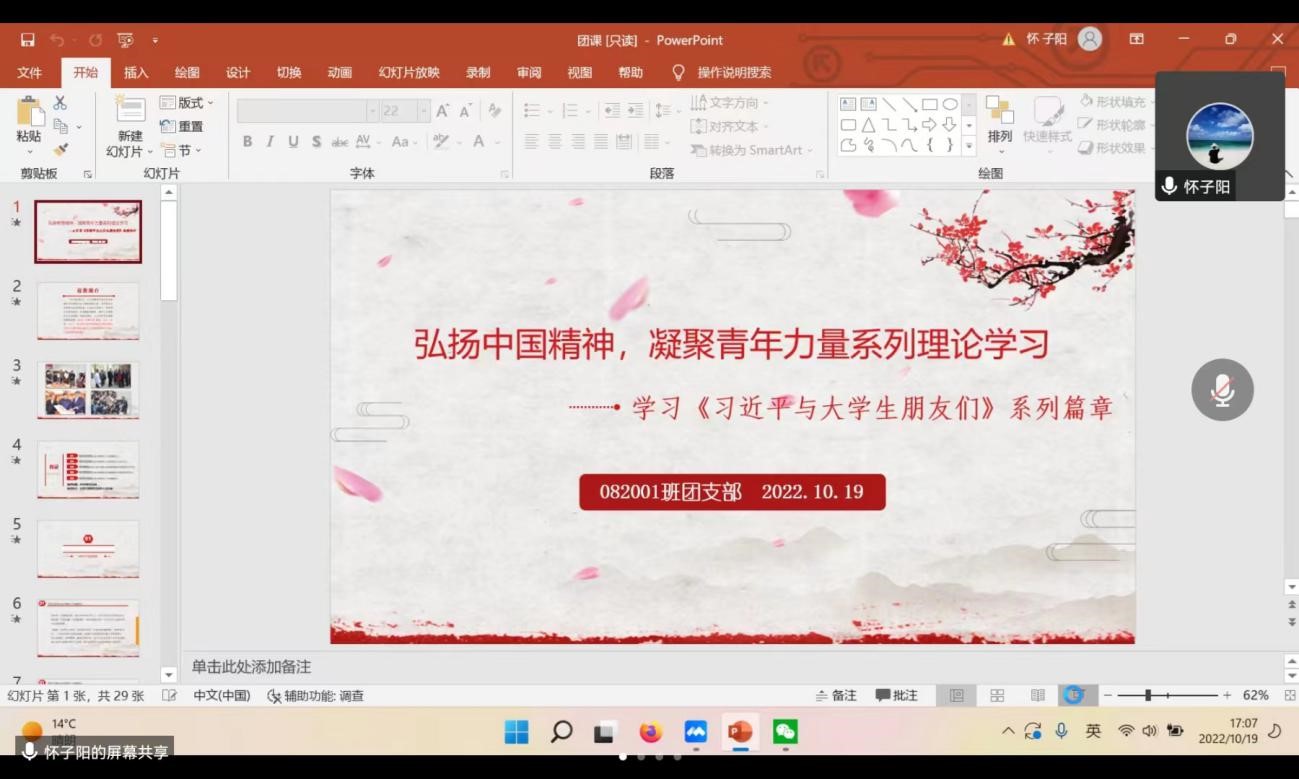 本次团日活动共包含学习解读,交流分享,总结收获三个环节,其间同学们认真思考、积极参与。活动伊始,各班团支书详细介绍了习近平总书记在北京大学考察时讲话的具体内容,深入阐述了习总书记提出的“爱国、励志、求真、力行”的深刻内涵,并寄语同学们,作为新时代的中国青年,要努力成长为德智体美劳全面发展的社会主义建设者和接班人,让中华民族伟大复兴在奋斗中梦想成真。在交流分享环节,李珍(2020级本科生)引用总书记的话语,强调广大青年要忠于祖国、忠于人民;立鸿鹄志、做奋斗者;求真学问、练真本领;知行合一、做实干家。苏小荔(2020级本科生)和吴晓彤(2020级本科生)两位同学则围绕总书记的“八字箴言”,表示了自身踔厉奋发、笃行不怠的决心,并鼓励同学们响应号召,做民族复兴的追梦者与圆梦人。活动最后,各班团支书总结归纳了同学们的发言,结合习近平总书记的讲话精神与日常的工作学习,呼吁大家牢记总书记的嘱托,在“团结起来,振兴中华”的时代强音感召下,一起书写无愧于时代、无愧于历史的华彩篇章。