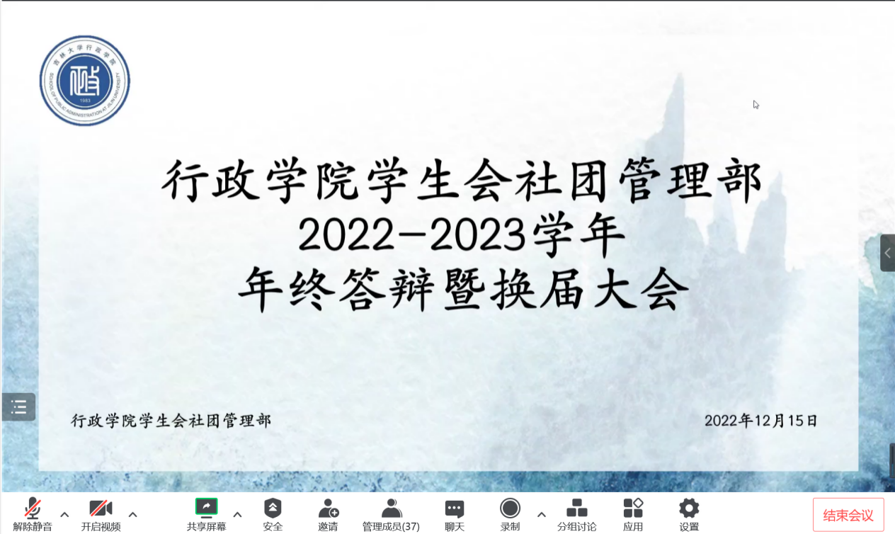12月15日,yl23455永利2022-2023学年社团年终答辩暨换届大会在线上举办,本科生辅导员高卓嫱、谷瑛淏及公司团学组织主要员工骨干出席并担任评委。