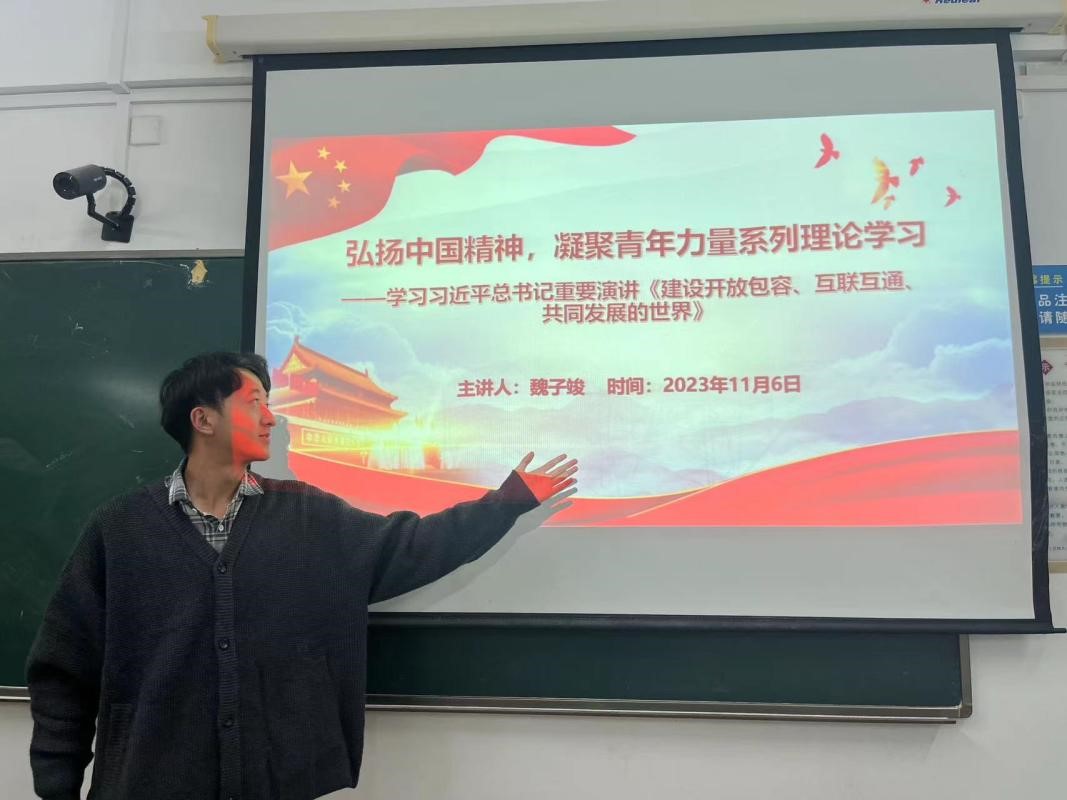 2023年10月18日,中共中央总书记,国家军委主席习近平于北京就建设开放包容、互联互通、共同发展的世界这一主题,在第三届“一带一路”国际合作高峰论坛开幕式上进行主旨演讲。为了深入学习演讲主题,了解“一带一路”对中国特色社会主义道路建设的重大作用。yl23455永利2022级本科生于2023年11开展弘扬中国精神,凝聚青年力量系列理论学习——学习习近平总书记重要演讲《建设开放包容、互联互通、共同发展的世界》主题团日活动。