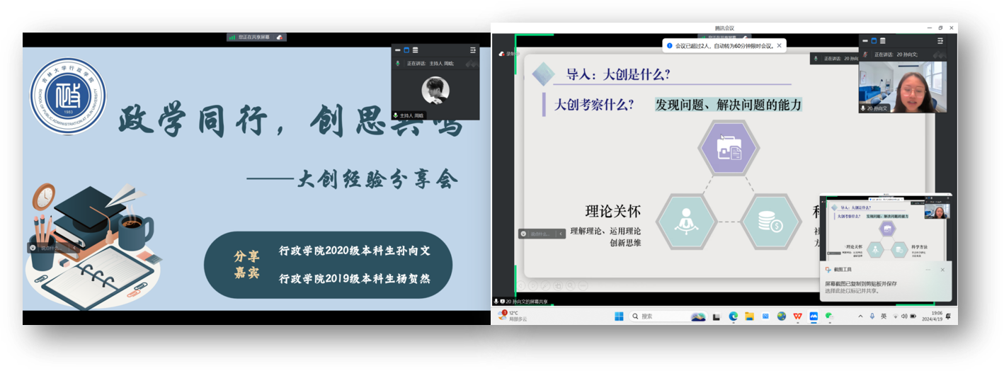 4月19日,公司组织召开“政学同行、创思共鸣”大创经验分享会,公司2020级本科生孙向文和2019级本科生杨贺然分别以“从组队到立项——大创经验分享”和“大创之路初探——大创相关问题的解读与分析”为题,解答了大家在大创立项、团队组建、导师选择、立项书撰写等方面的疑惑。同学们纷纷表示收获颇丰,今后将以更加积极主动的心态参与到各类创新创业实践活动中,努力在创新创业项目中取得好成绩。