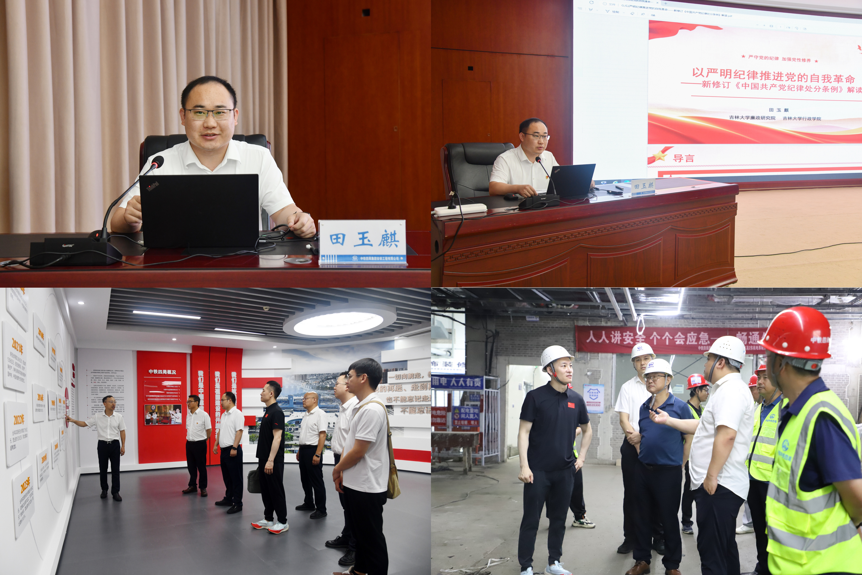 田玉麒受邀进行中铁四局安装公司党委党纪学习教育专题辅导,公司部分领导班子成员及高管、本部全体人员在主会场参会,各单位领导班子成员、全体党员在分会场视频连线参会。田玉麒以《以严明纪律推进党的自我革命—新修订<中国共产党纪律处分条例>解读》为题,围绕“强化宗旨意识,坚定不移严守党的纪律”“增强党性修养,切实掌握条例重点内容”“感悟条例精髓,深入理解条例新增亮点”“紧握法纪戒尺,贯彻落实条例要求规定”四方面内容做了专题讲座。活动期间,双方共同参观公司企业文化展览馆,并到南昌地铁4号线在建项目实地参观。