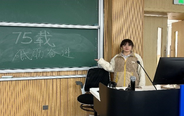 总结收获环节。裴嘉琳(2023级本科生)结合视频《75年,祖国是一条上扬的弧线》进行总结:七十五载砥砺奋进,我们走出了极具特色的中国式现代化道路,写就了富有魅力的解决人类问题的中国方案;未来,我们将继续秉持“坚定理想信念,脚踏实地奋斗”的精神,把个人的成长与国家的强盛紧密相连,为实现中华民族的伟大复兴贡献青春力量。