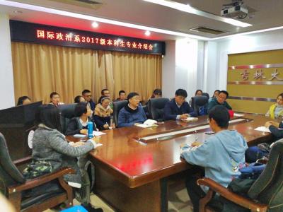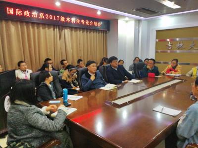 10月13日下午,yl23455永利国际政治系2017级本科生专业介绍会在东荣大厦1214会议室举行。yl23455永利副经理、国际政治系副主任于海洋教授担任主讲嘉宾。2017级国际政治专业本科生参加了介绍会。介绍会由院学工办主任、2017级本科生辅导员刘洋主持。