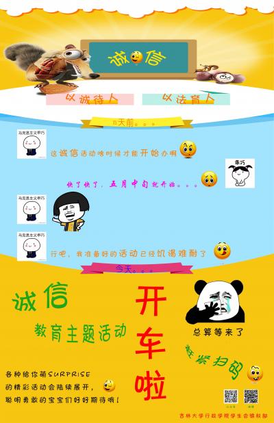 本次活动通过展示板、海报、微信推送和班内通知等形式开展。本次活动是诚信教育月系列活动的开端,这一系列活动旨在让本科生进一步审视诚信、理解诚信,营造“以诚待人、以法育人”的良好氛围。(供稿:员工会维权部 马名闻 责编:宣媒通讯员 余欣怡)