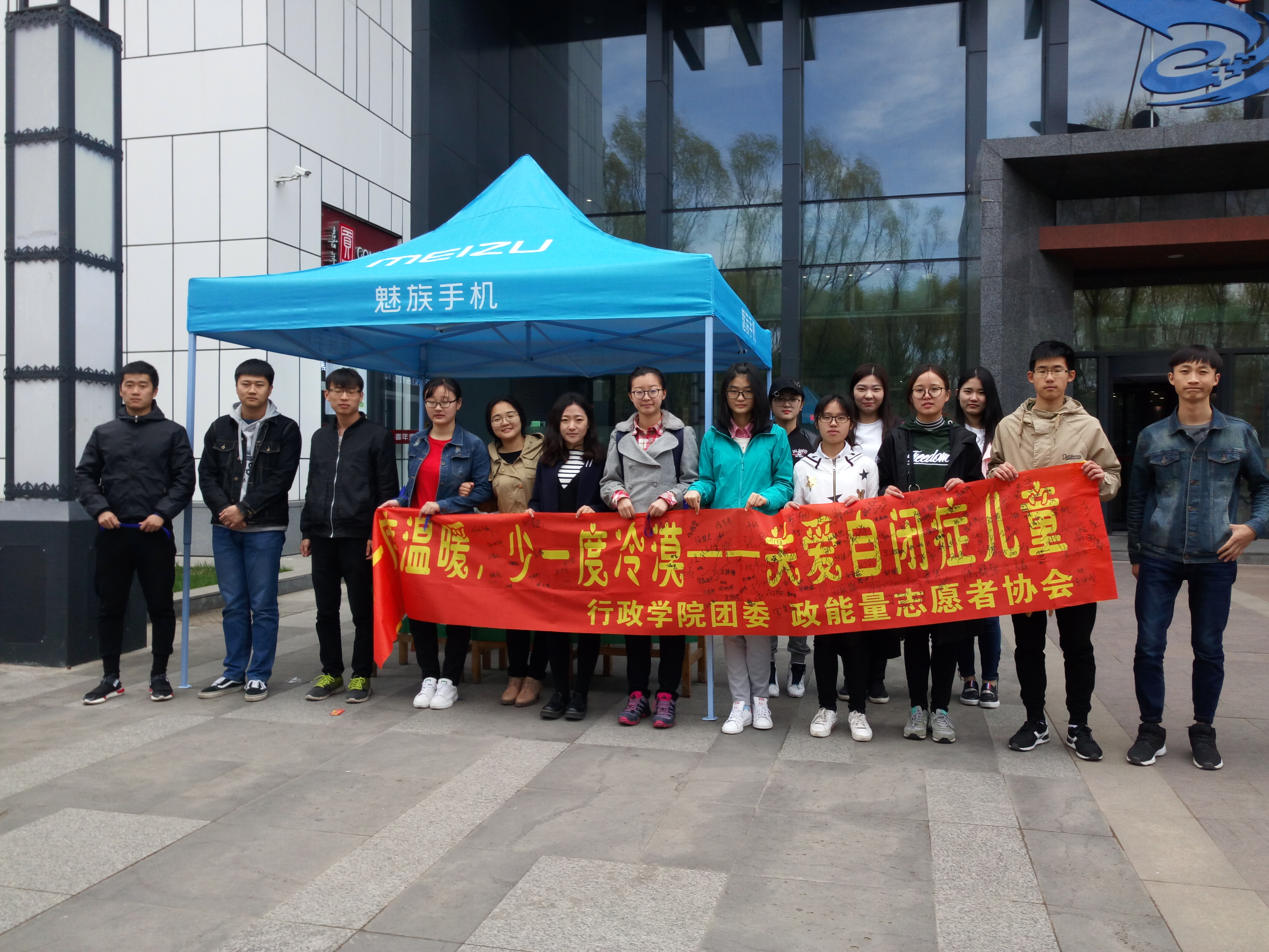 志愿者们向路人分发蓝丝带、宣传自闭症的相关知识,并邀请同学们在条幅上签名,使更多的同学关注和了解自闭症。活动结束后志愿者们合影留念。(图文 政能量志愿者协会 责编 宣媒中心通讯员张萌)