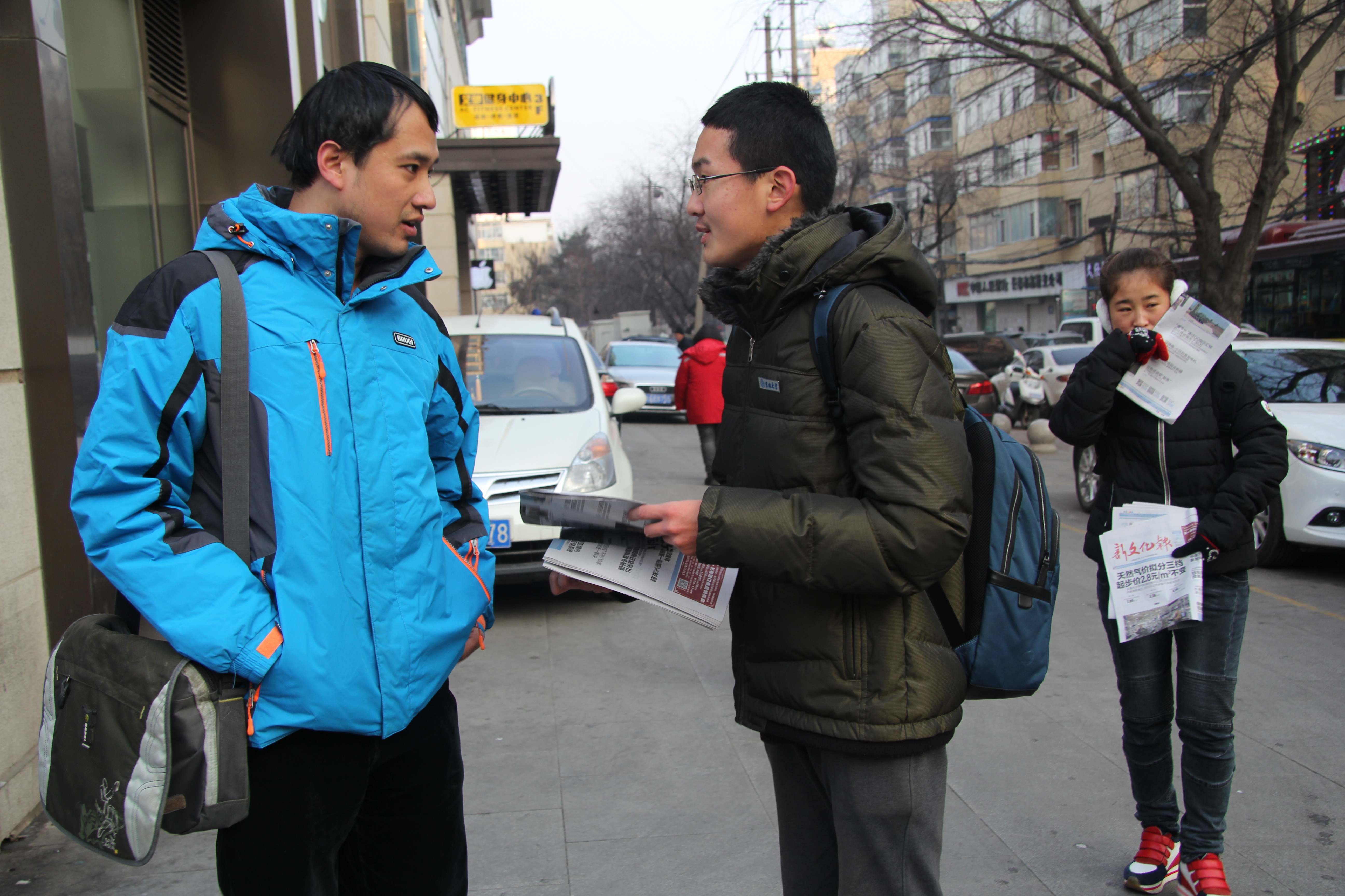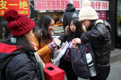 下午1时,同学们在五月花广场集合。全班同学被分成十个小组,按照划定的小组,前五组乘13路公交车前往重庆路,后五组乘315路公交车前往桂林路。由于许多同学是第一次参加此类活动,面对路人,同学略显羞涩,不敢向路人推销手中的报纸。义卖工作一时难以展开。后来,在小组成员的共同努力与尝试下,同学们快速适应了环境,勇敢地走进人群,推销自己手中的报纸,义卖活动顺利进行。面对每份一元的售价,大多数人都愿意出更高的价格购买报纸,甚至一些市民主动提出捐款的想法。冬日虽冷,但同学们的内心是温暖的。下午3时左右,同学们手中的报纸销售一空,义卖活动顺利结束。
